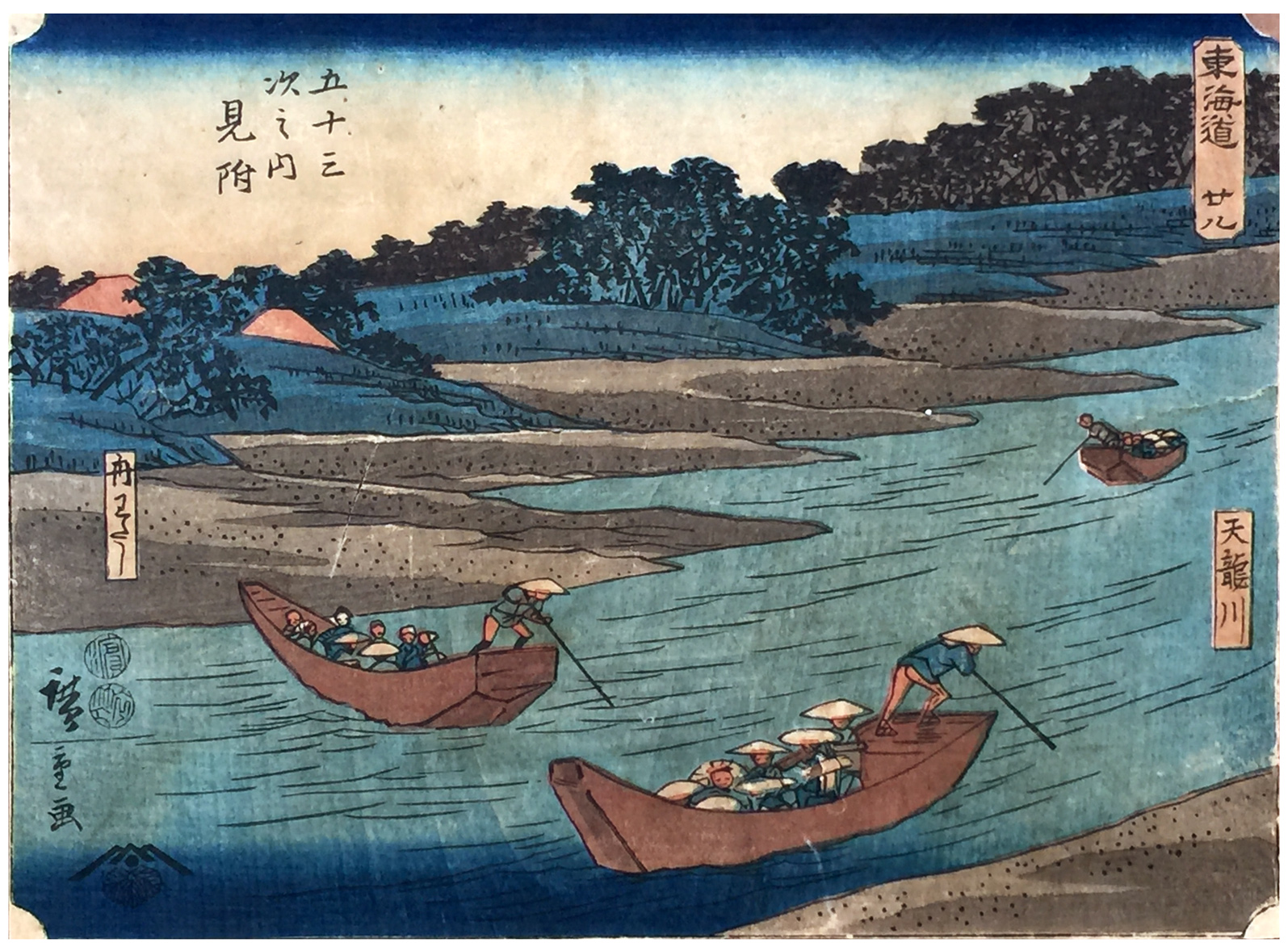 Notes: Great river / water scene from Hiroshige. This print has a very strong wood grain synonym or very early printing.