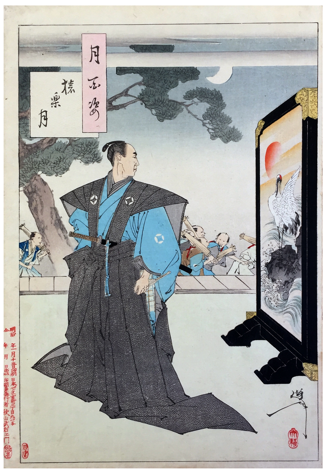 More about this print: Sarugaku (literally Monkey-music) involved acrobatics, juggling, and mime, combined with drum dancing. It is considered to have been one of the sources from which the Noh theatre developed. The people passing behind a rather stern and aloof looking samurai rush to find seats for the New Year Sarugaku performance on the grounds of Edo Castle. The samurai may be the envoy that was yearly sent by the emperor in Kyoto, as the on stage screen shows a red-crowned crane and the rising sun, both symbols of the imperial family.