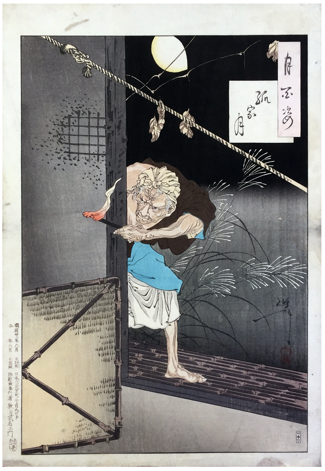 More about this print: The woman holding the torch in this 1890 design is serving a lord who has a strange disease that can only be cured with the blood of unborn children. Here the old hag presumably is checking on a victim that is being suspended from the ceiling of her house. An echo from Yoshitoshi's gruesome - and possibly banned - 1885 diptych "The Lonely House on Adachi Moor"