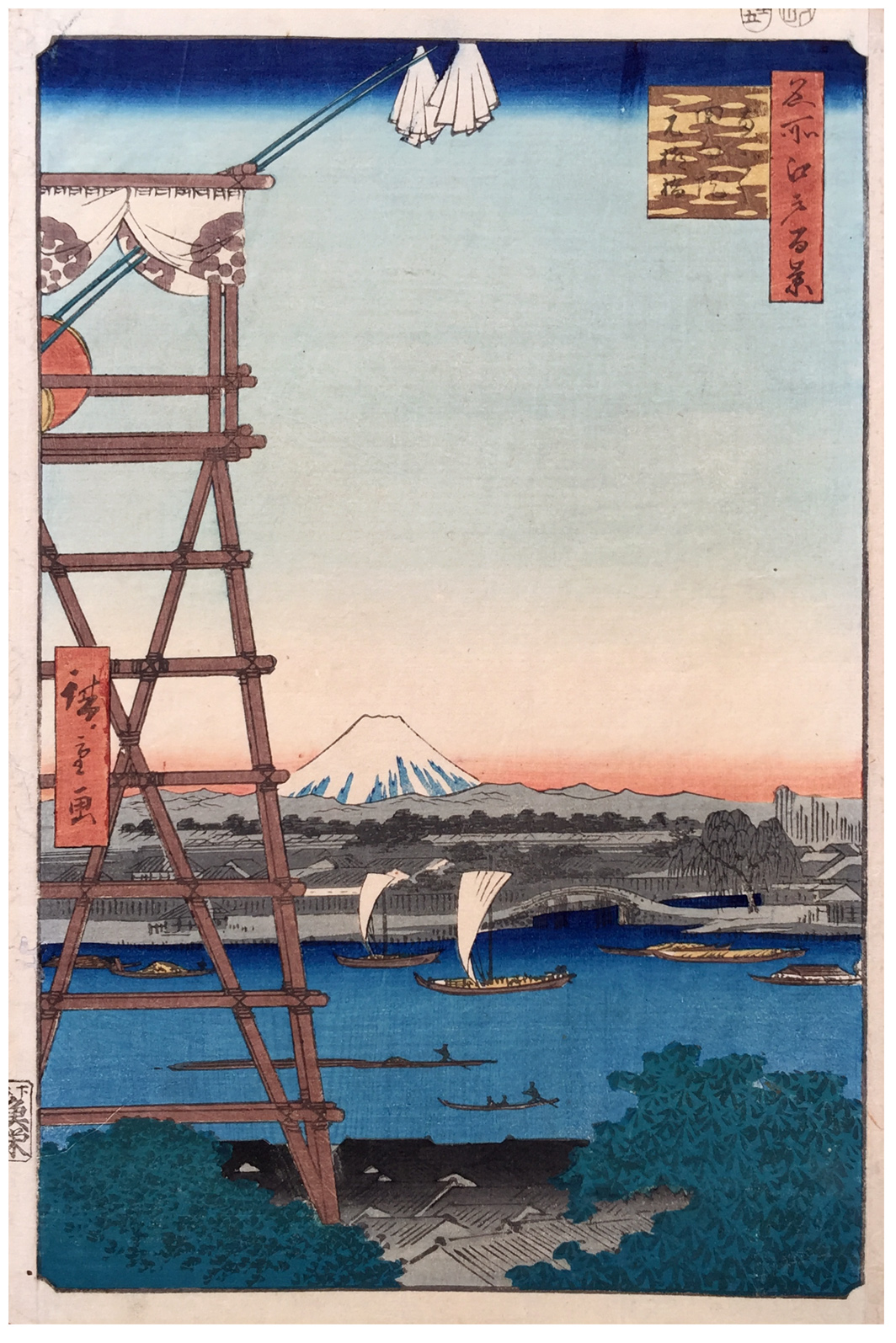 More about this print: Hiroshige has used an oblique vantage point to Mount Fuji to create a sense of excitement in an otherwise placid scene. The giant drum-tower at the left is the focus of the biannual sumo tournament on the grounds of the Buddhist temple of Ekōin.