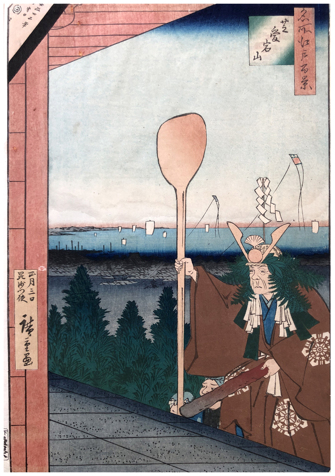 More about this print: Hiroshige dramatically interrupts this view from Mount Atago in the district of Shiba southwest of Edo with a figure holding an immense rice paddle. The inscription over the artist's signature to the left identifies the figure as the central actor in the "Heaping Rice Ceremony" performed at the Atago Shrine on the third day of the New Year. In real life, this man was the proprietor of the Atagoya teahouse at the top of Mount Atago. Here however he is dressed in an elaborate costume emblematic of the New Year and of prayers for its bounty.
