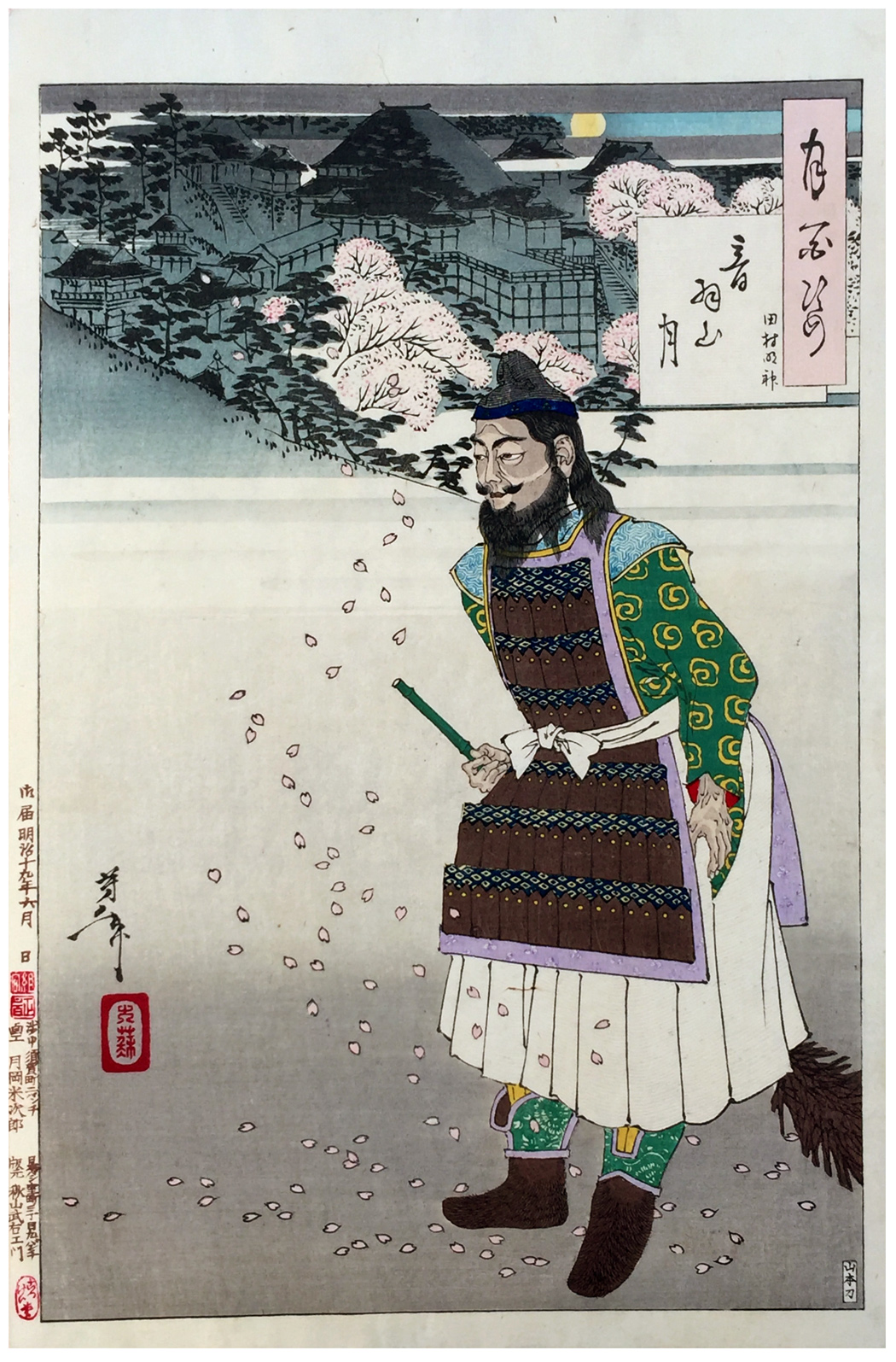 More about this print: This represents a scene from the Noh play Tamura. Three itinerant priests meet a man sweeping fallen cherry petals as they visit Kiyomizu Temple in Kyoto. He is supposed to have been the spirit of the warrior Sakanoe no Tamuramaro, who assisted the priest Enchin in founding Kiyomizu Temple on Mount Otawa.