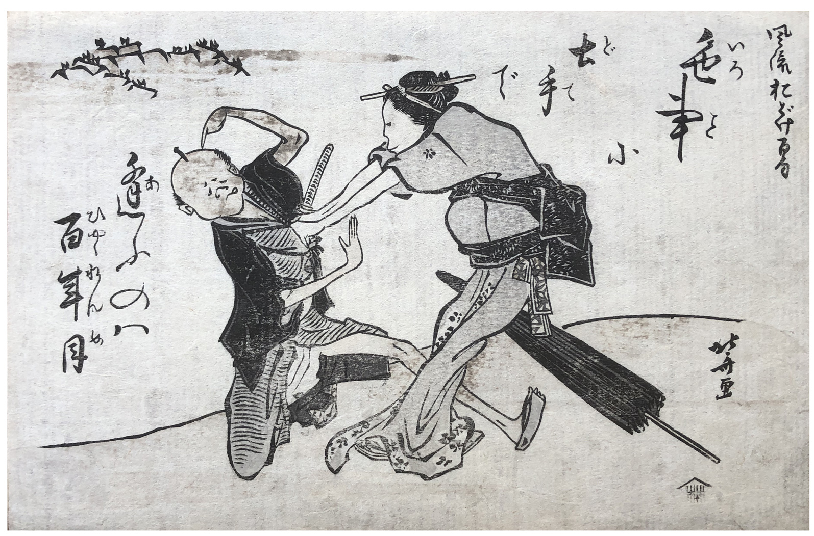 Woodblock Print Title: Nail in Head as Affair Cover, from the series One Hundred Comic Poems (Furyu odoke hyakku)