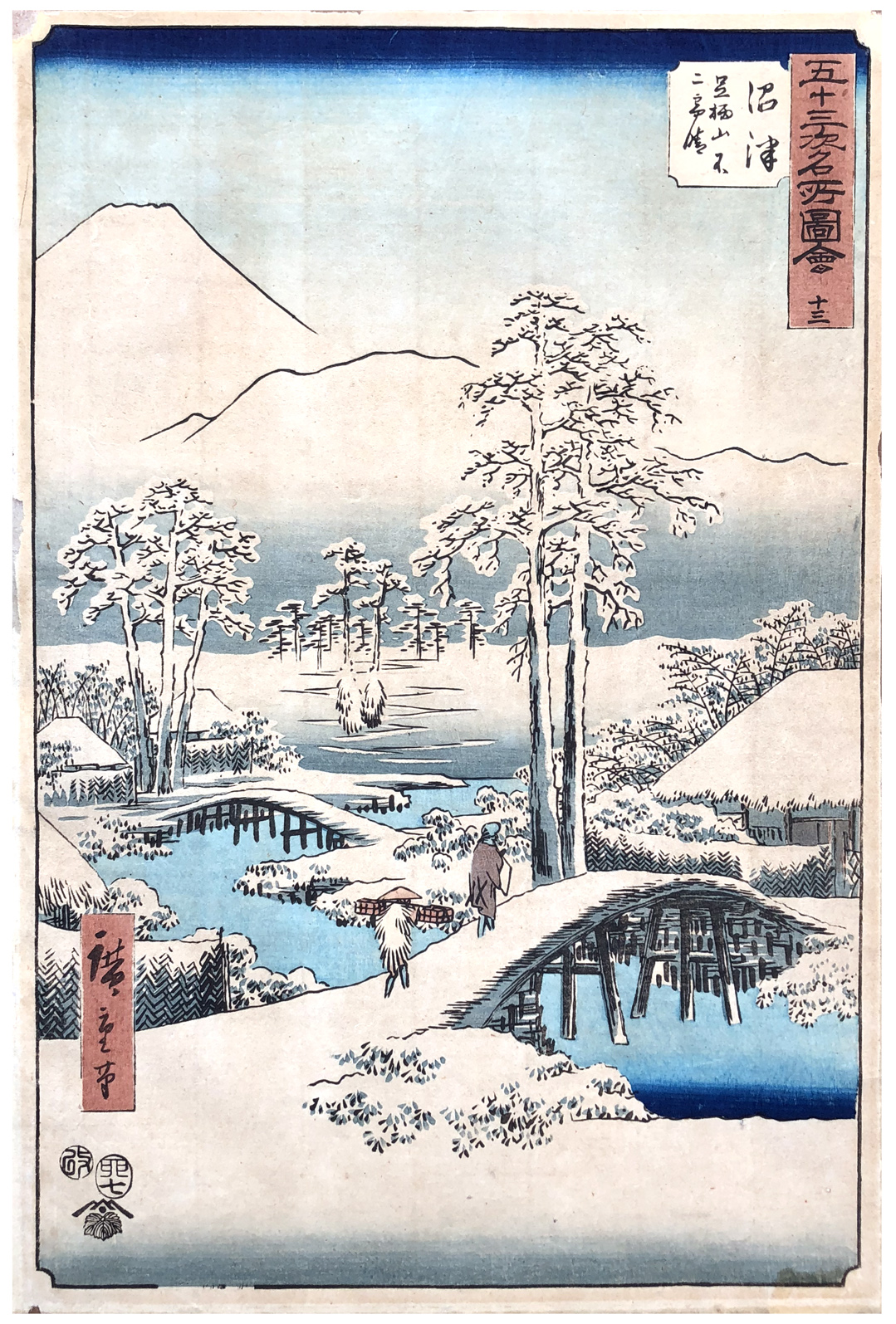 Woodblock Print Title: Numazu: Fuji in Clear Weather after Snow, from the Ashigara Mountains (Numazu, Ashigarayama Fuji no yukibare), from the series Famous Sights of the Fifty-three Stations (Gojusan tsugi meisho zue), also known as the Vertical Tôkaido