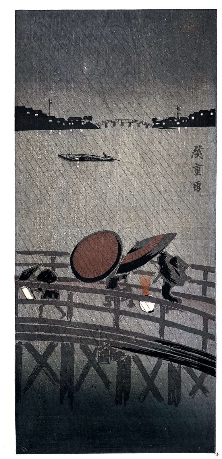 Woodblock Print Title: Night Rain at Izumi Bridge
