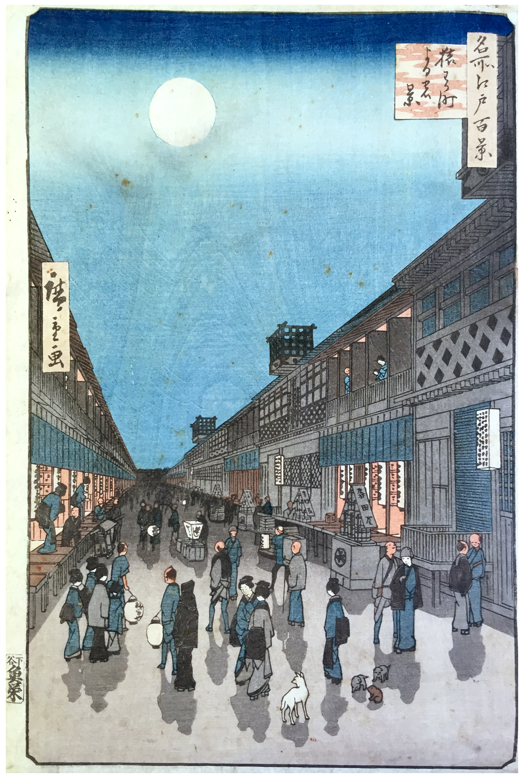 HEREMore about this print: As the full moon rises high in the autumn sky, its rays bathe Saruwaka-machi, the theater district of Edo, with silver light. The moonlight also displays an array of shadows that seem to have a life apart from the gray and black figures that cast them.