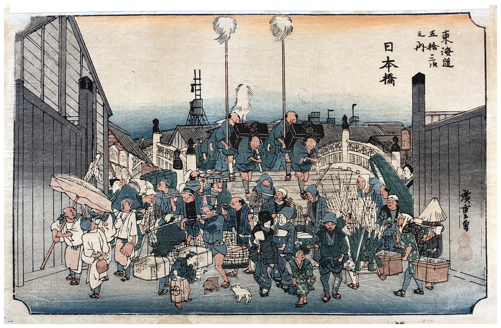 Woodblock Prints Title: Nihonbashi: Daimyo Procession Setting Out (Nihonbashi, gyoretsu furidashi), from the series Fifty-three Stations of the Tokaido Road (Tokaido gojusan tsugi no uchi), also known as the First Tokaido or Great Tokaido