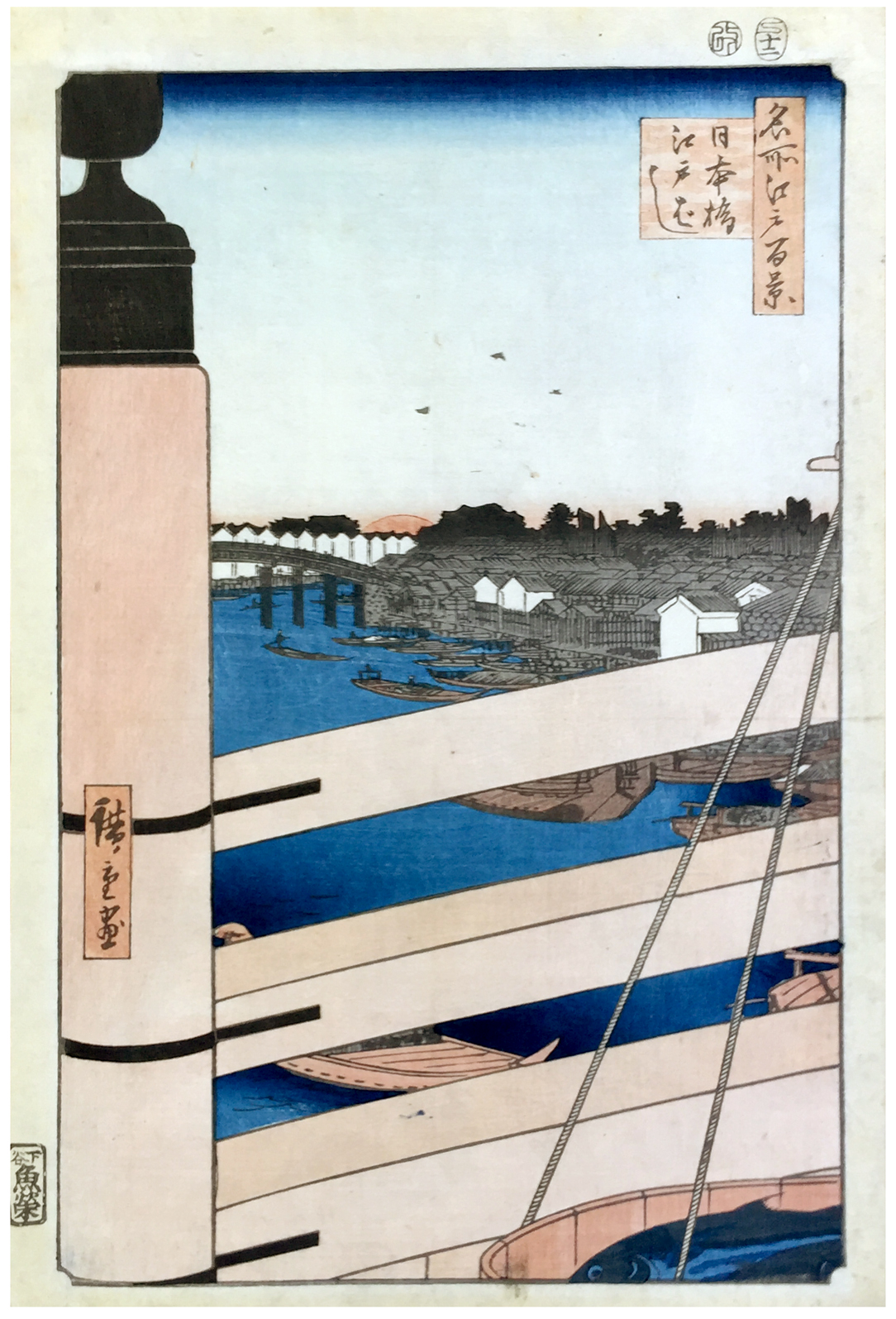 Woodblock Prints Title: Nihonbashi Bridge and Edobashi Bridge (Nihonbashi Edobashi), from the series One Hundred Famous Views of Edo (Meisho Edo hyakkei)