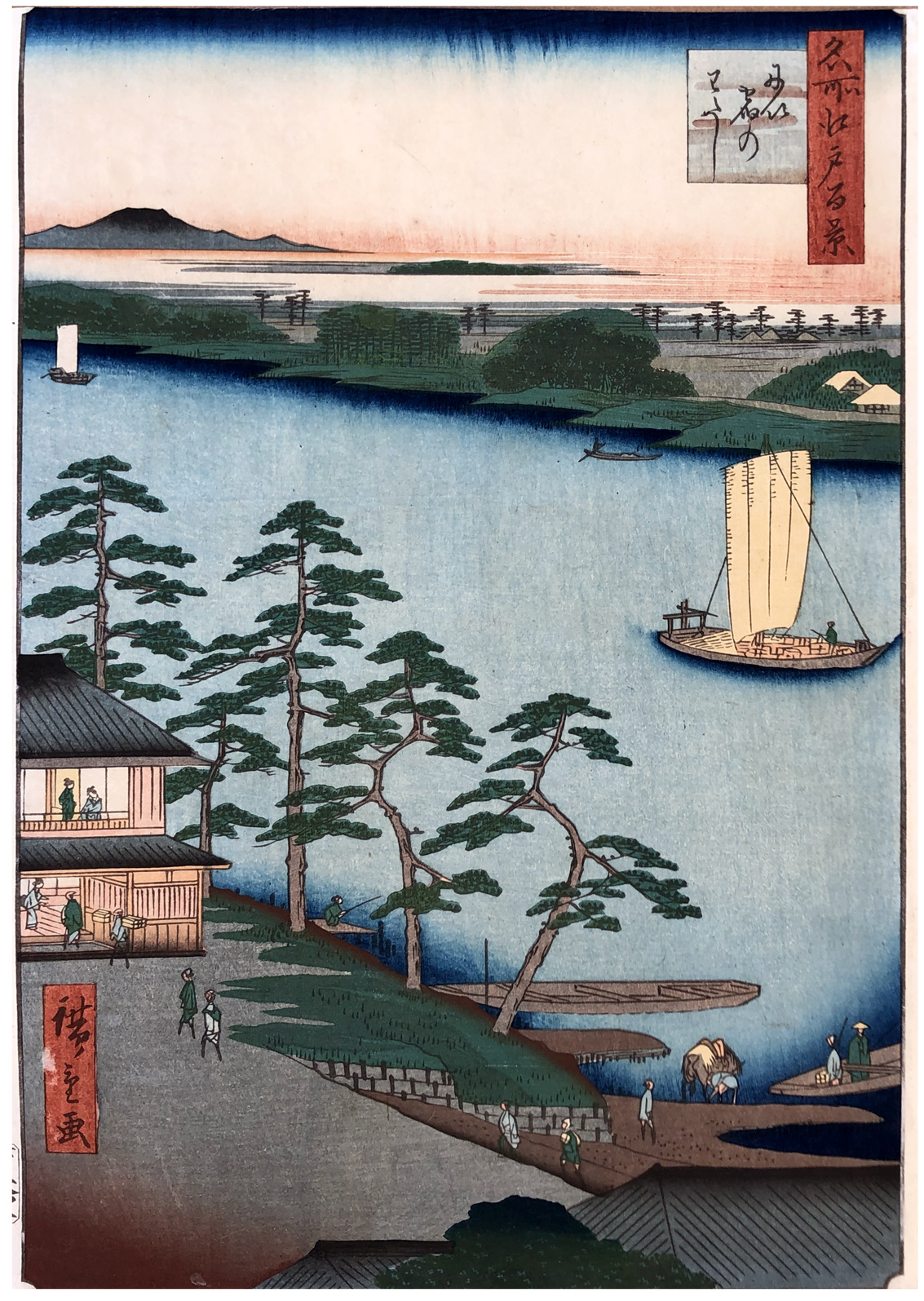 More about this print: This print is similar in theme and composition to the view of Kawaguchi Ferry in number 20. Both are views of ferry crossings on major roads leading out of Edo, and as the most distant points in the series for their respective directions (north for Kawaguchi and northeast here), they serve to mark the outer geographical limits of the series as a whole. It is for this reason that both have the look of straightforward topographical prints, important more to fix boundaries than to highlight famous places.