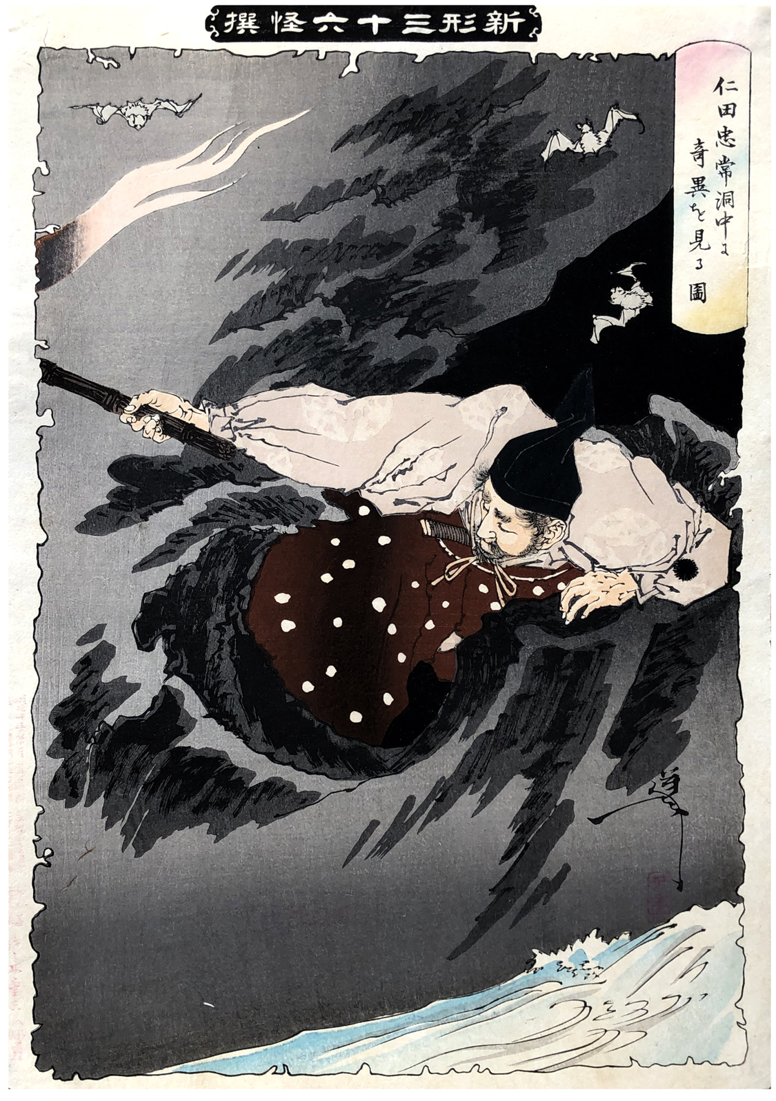 Woodblock Print Title: Nitta Tadatsune Discovering an Apparition, from the series Shinkei sanjurokkaisen (The new forms of the thirty-six ghosts)
