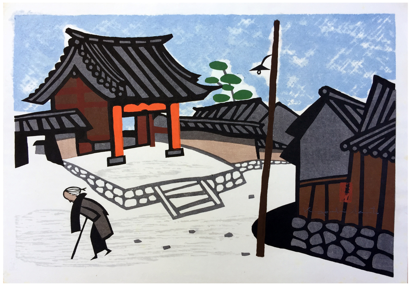 Woodblock Prints Title: Old lady Walking in Snow in Aizu