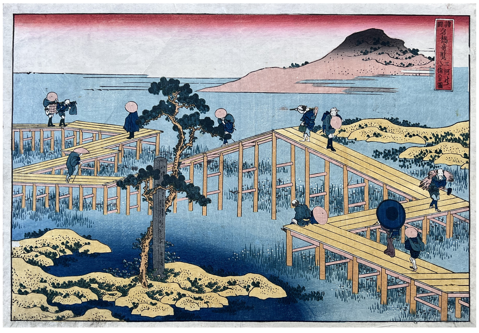 Woodblock Print Title: Old View of the Eight-part Bridge at Yatsuhashi in Mikawa Province (Mikawa no Yatsuhashi no kozu), from the series Remarkable Views of Bridges in Various Provinces (Shokoku meikyō kiran)