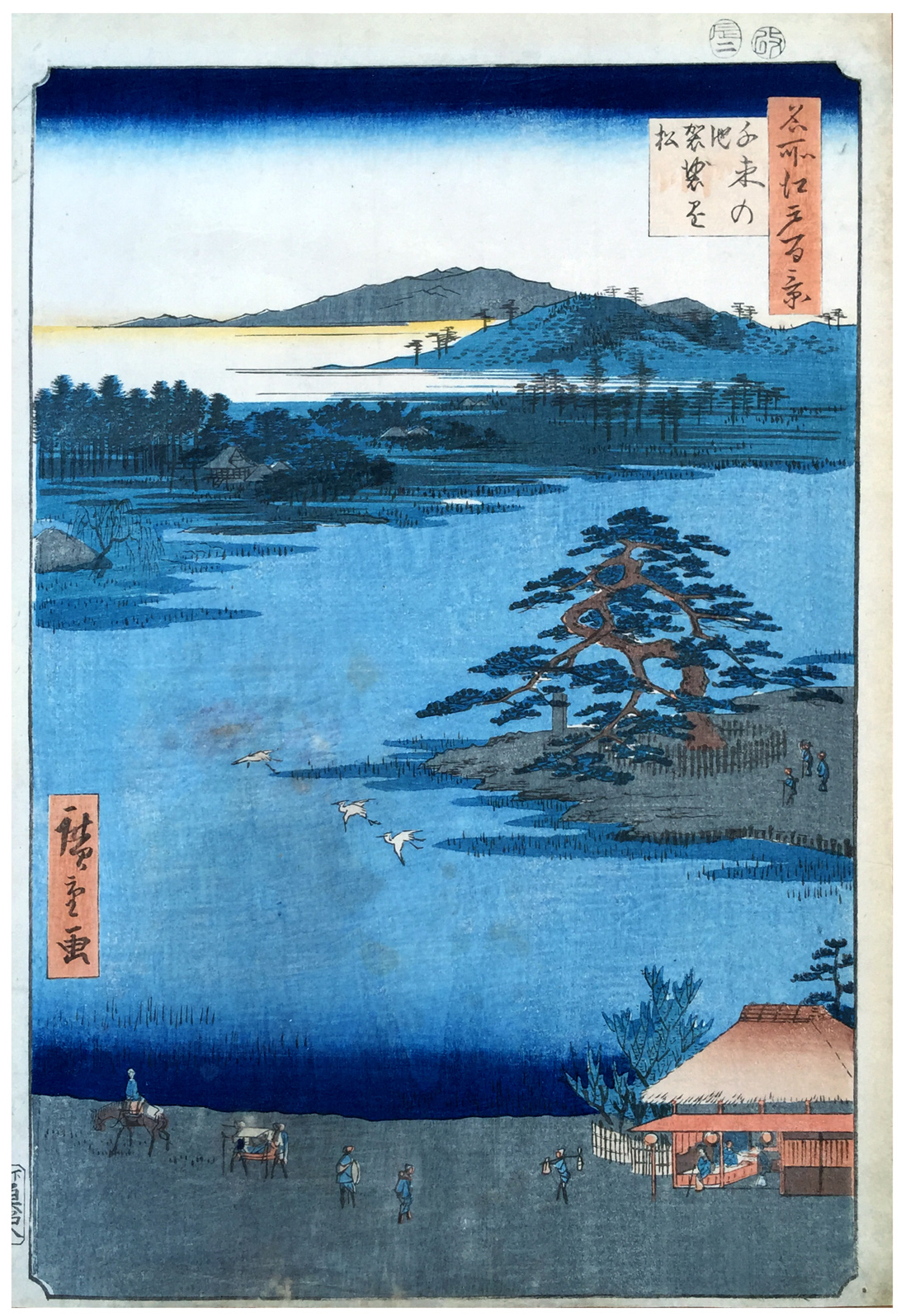 More about this print: The Robe-Hanging Pine of the title, which we see at the tip of a small spit of land jutting into Senzoku Pond, still survives. Legend associates it with the great medieval Buddhist leader Nichiren, who supposedly stopped by the pond to rest and used the tree to hang his kesa, a sashlike garment worn by Buddhist priests.