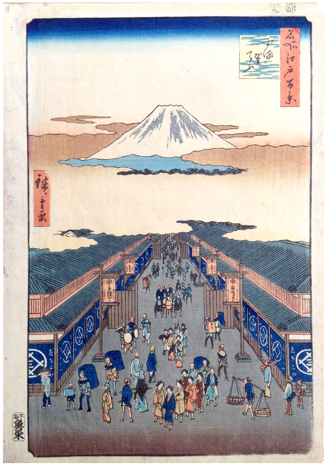 More about this print: What distinguishes Hiroshige's design in this print is its resolute symmetry, softened only by the irregular stylized cloud forms traditionally used in Japanese paintings to separate scenes in pictorial narratives. Here this compositional device focuses attention on Mount Fuji above and the urban bustle below in the street called Suruga-chô. Included in this scene is Japan's premier store, Echigoya, presently Mitsukoshi Department Store, still the most venerable of all the great merchandisers of Tokyo. It is identified by its crest, a circle around the characters for "three" and "well," which together read "Mitsui."