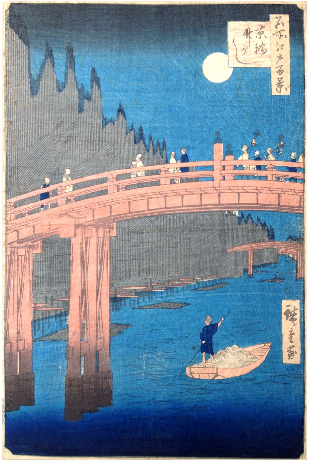 The characters "Hori-Take" on the lantern of the figure just left of center on the bridge are the hidden signature of Yokogawa Hori-Take, one of the best known carvers of the day, an artisan responsible for engraving many of Hiroshige's designs of the 1850s. Here he has inserted his name on the one print most appropriate to its literal meaning: "Carver Bamboo"