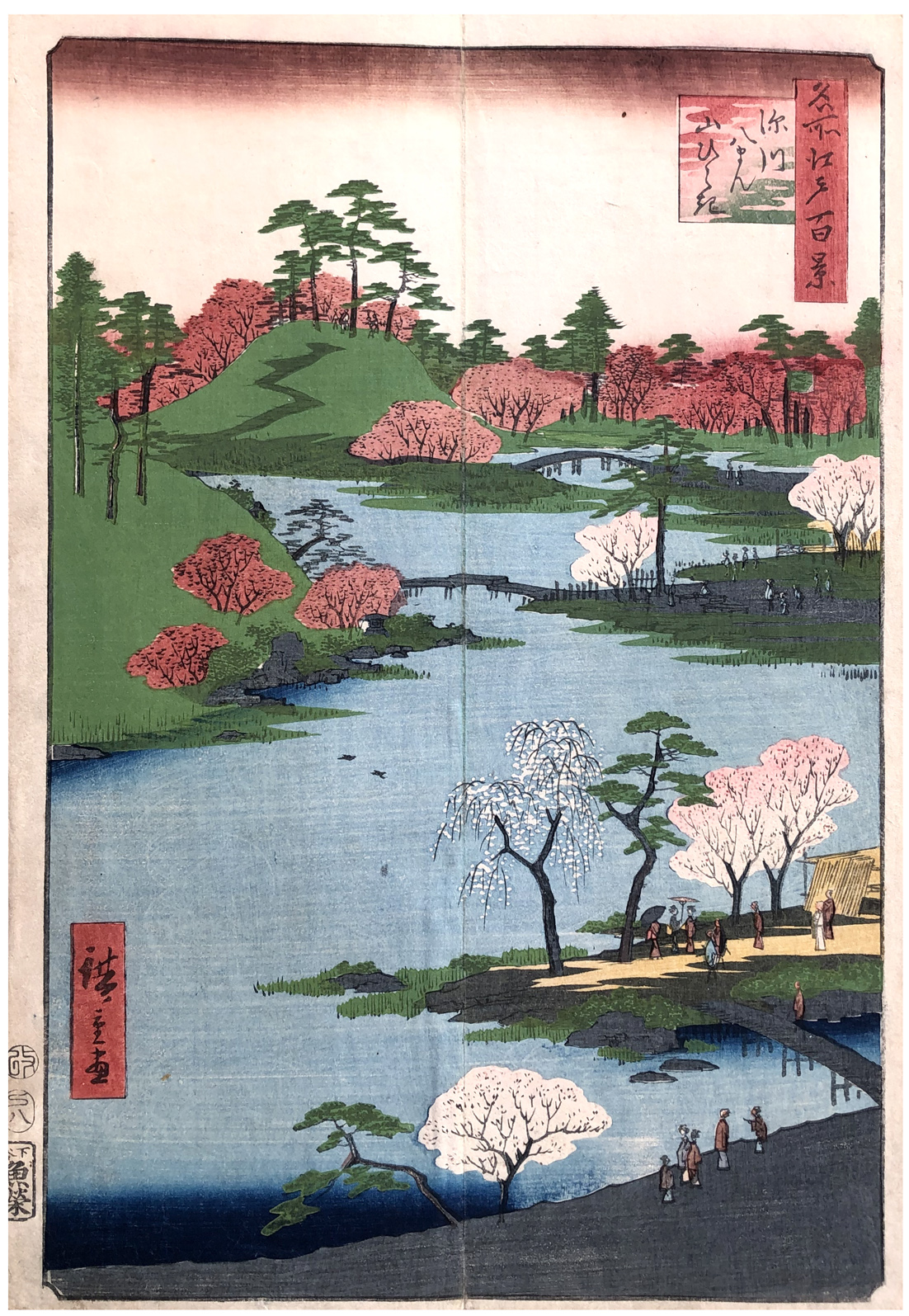 More about this print: This brightly colored print shows one of the most famous temple gardens of Edo, that of Eitaiji Temple in the Fukagawa district. One special feature of the Eitaiji Temple garden was that it was open only one short period each year, beginning on the twenty-first day of the Third Month, the occasion of a memorial ceremony for Kobo Daishi, founder of the Shingon sect of Buddhism. Although typically the public was not able to view the blooming of both pink cherries and red azaleas at the same time, the scene Hiroshige depicts here would have been possible every few years thanks to the variability of the lunar calendar.