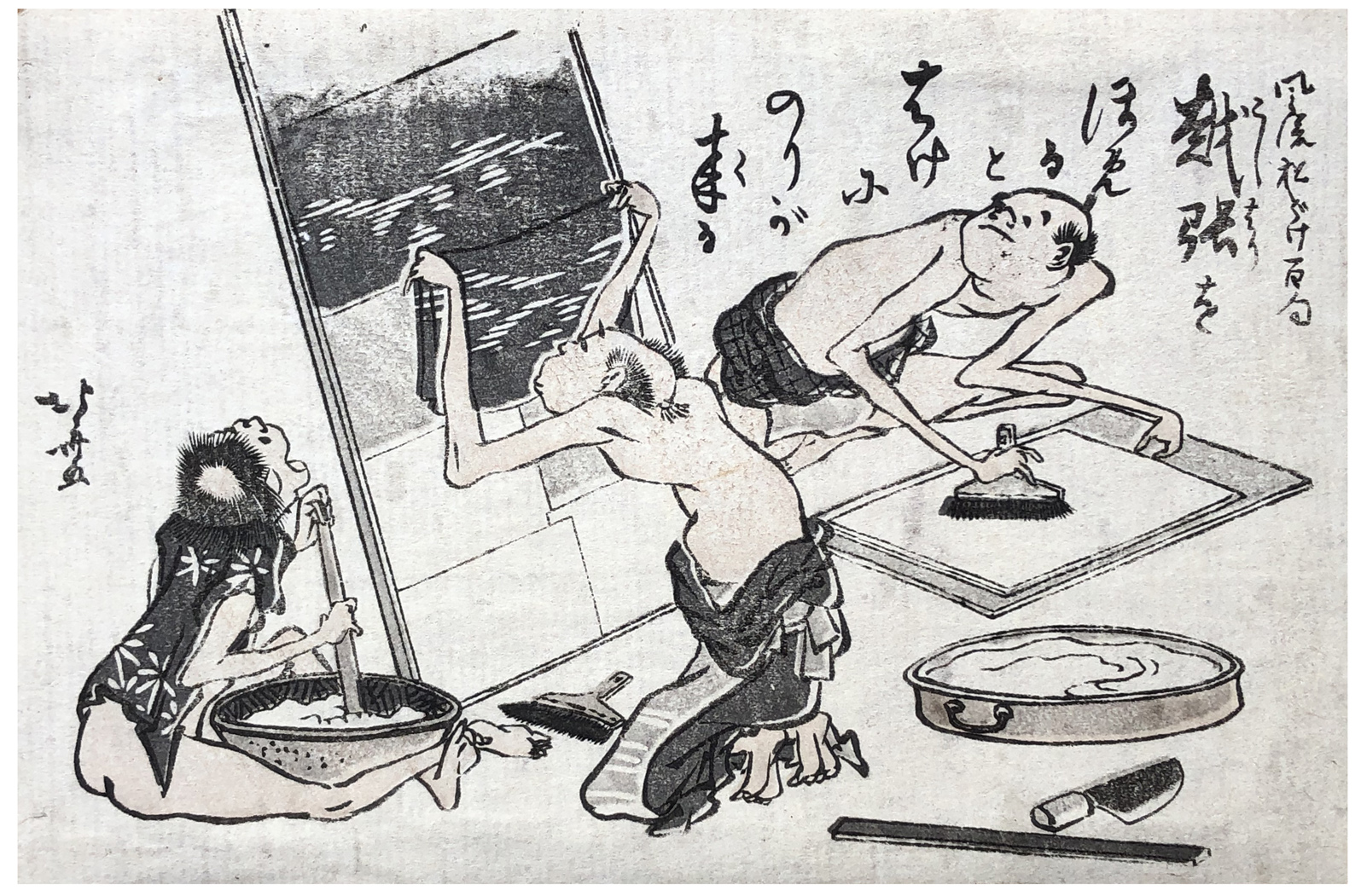 Woodblock Print Title: Paper Making, from the series One Hundred Comic Poems (Furyu odoke hyakku)
