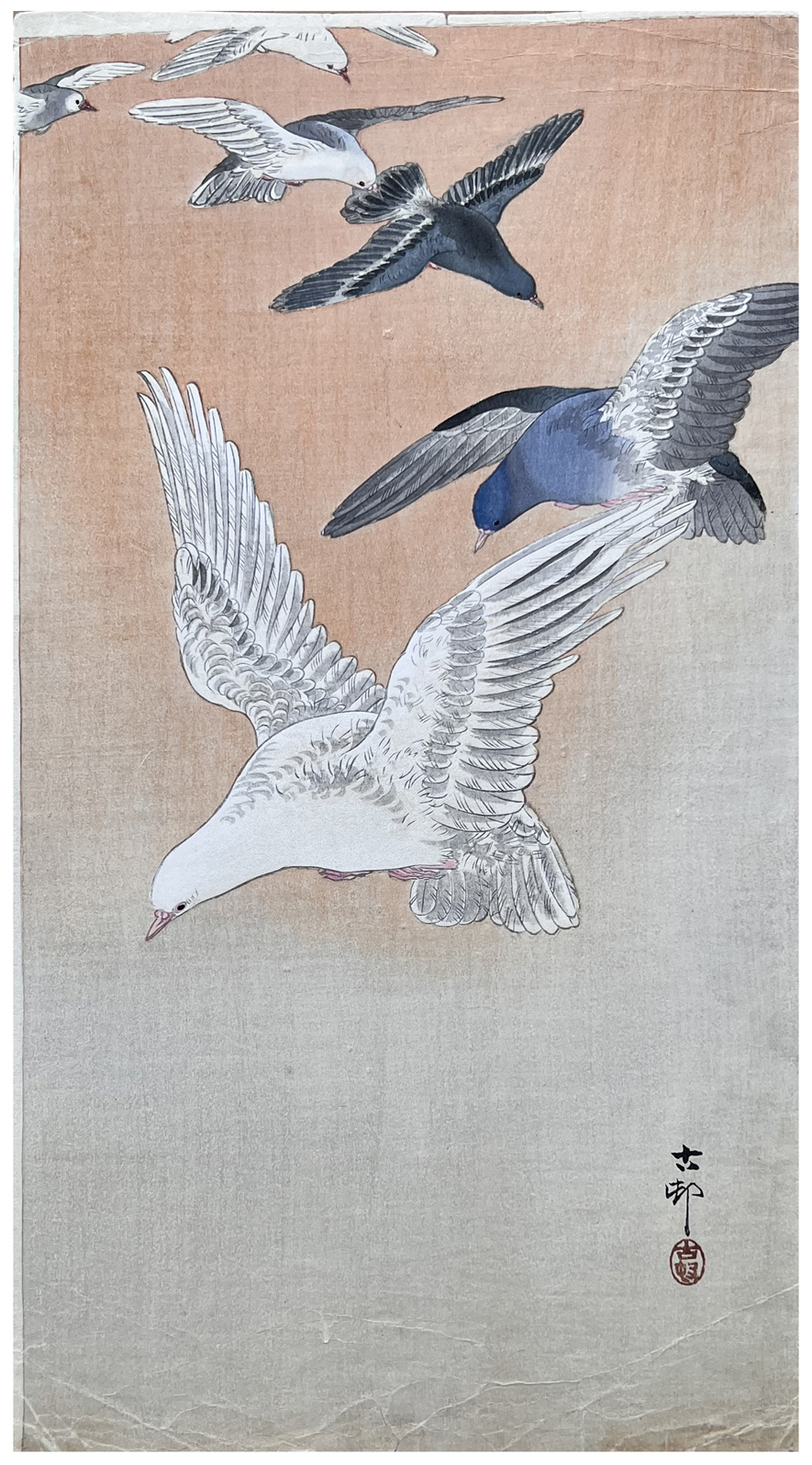 Woodblock Print Title: Pigeons in Flight