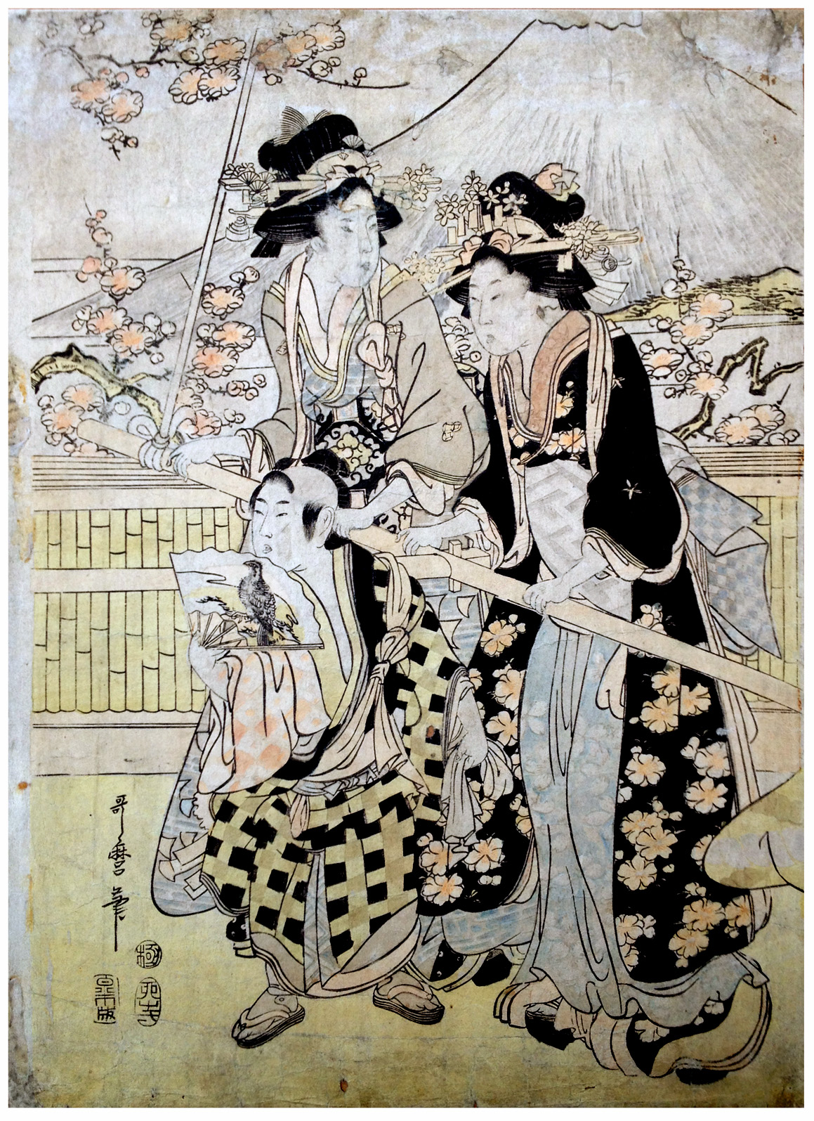 Condition: Slight Green Color fading, a couple of wormholes, some spots of soiling, and a couple of repairs including one in the face of one courtesan. Overall fair to good condition consistent with prints from late 18th century / Early 19th century.