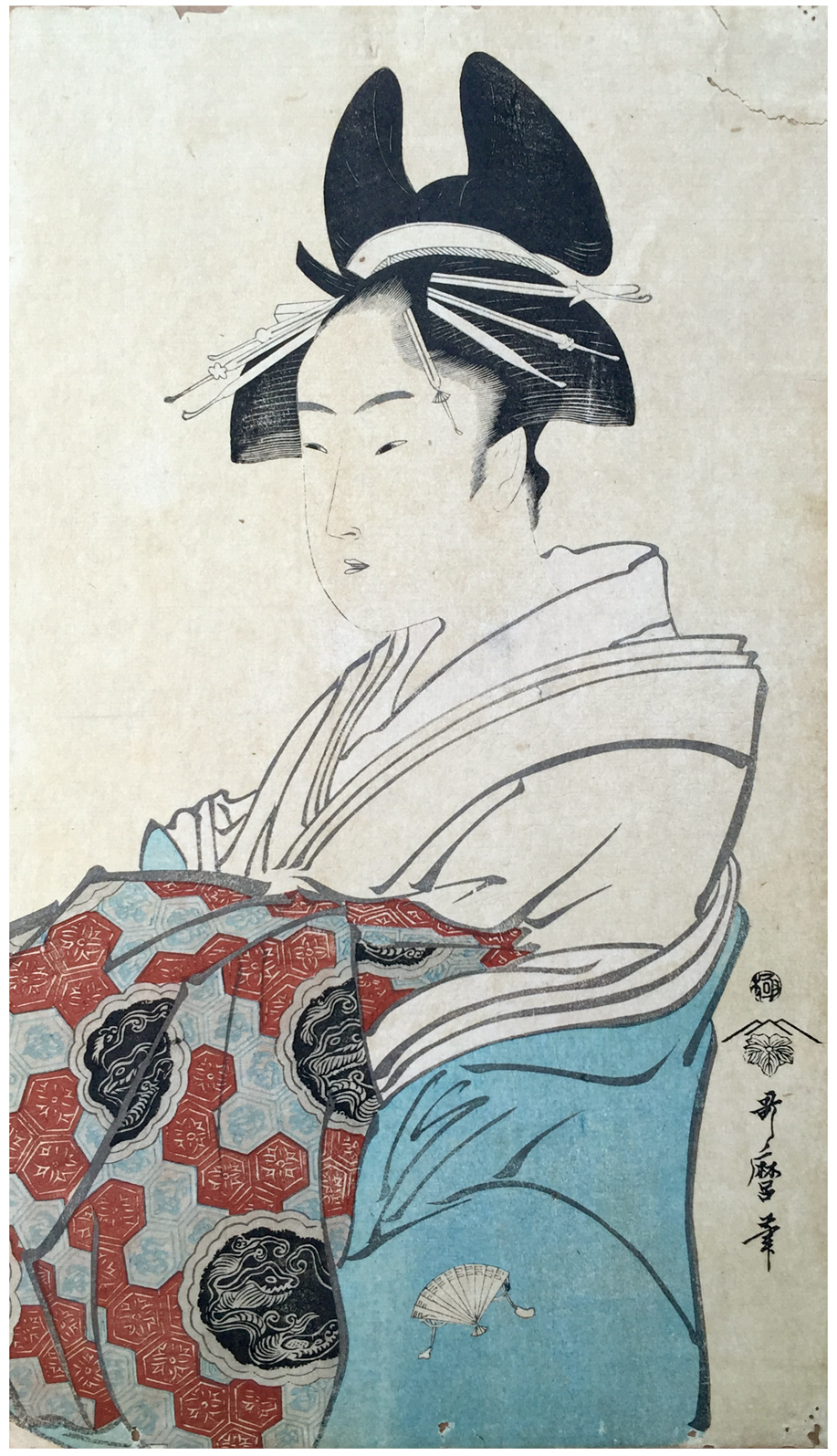 Notes: Blue and brown colors are original, and it is rare to see original prints from Utamaro with their original colors. Most of the "colored" Utamaro print are either later reprint, or re-colorized posthumously.