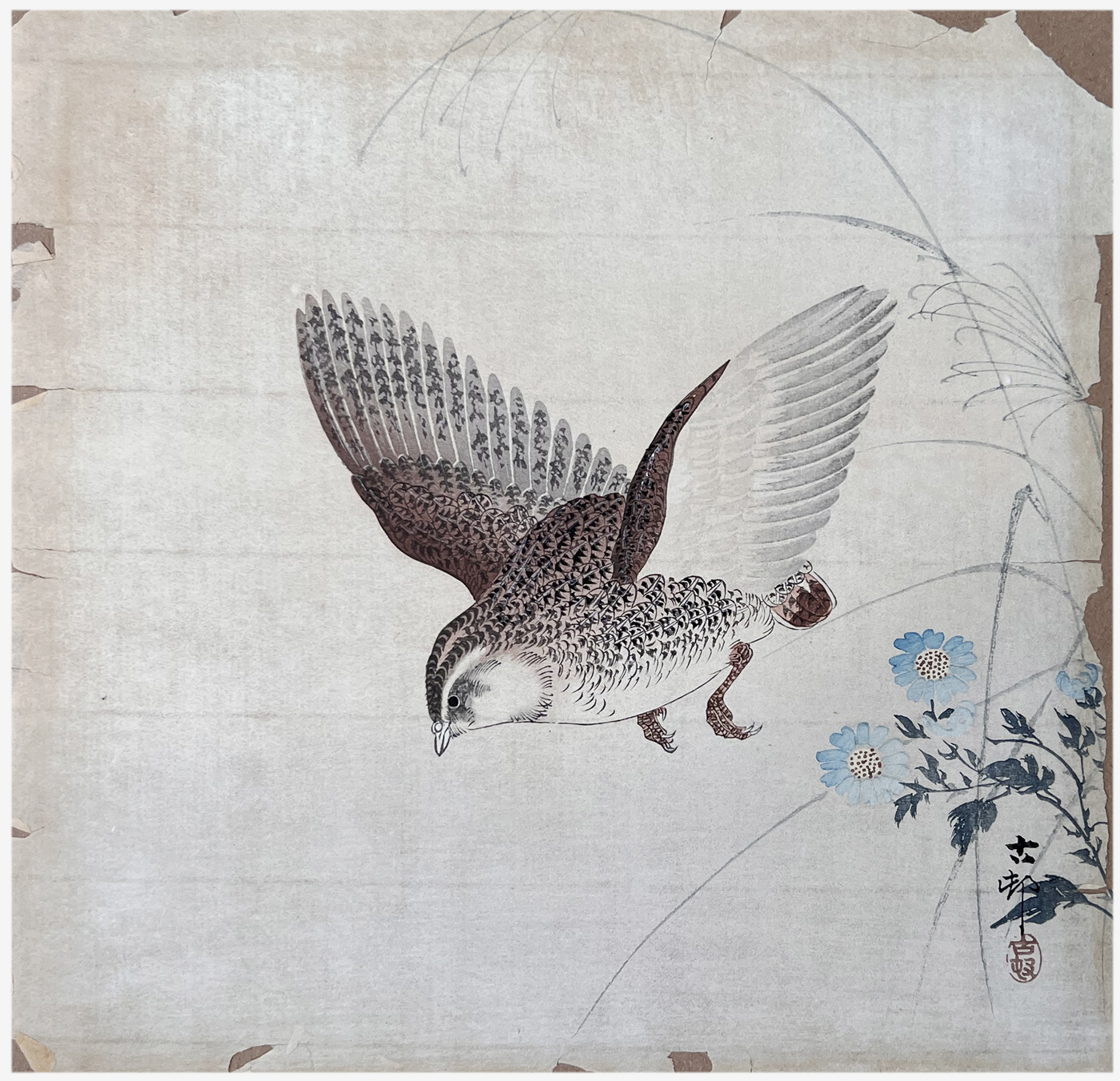 Woodblock Print Title: Quail in Flight