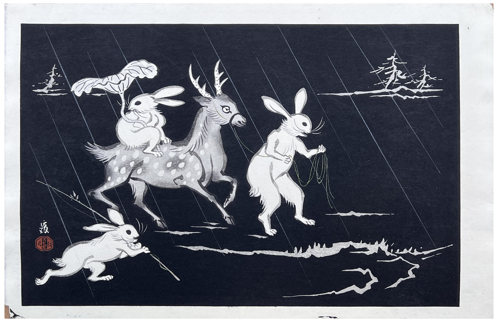 Woodblock Print Title: Rabbits and Deer