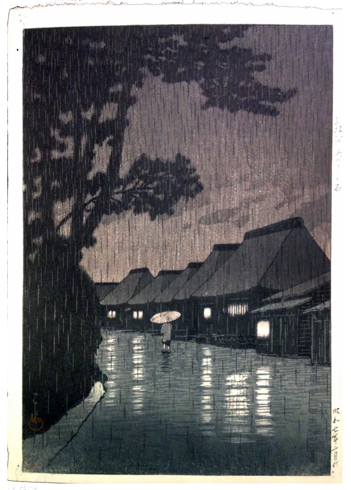 Notes: Splendid, beautiful rain print from Kawase Hasui, bearing the RED "J" (6mm) Seal from Wanatabe. This print is absolutely sumptuous, in pristine condition, with very bright colors.