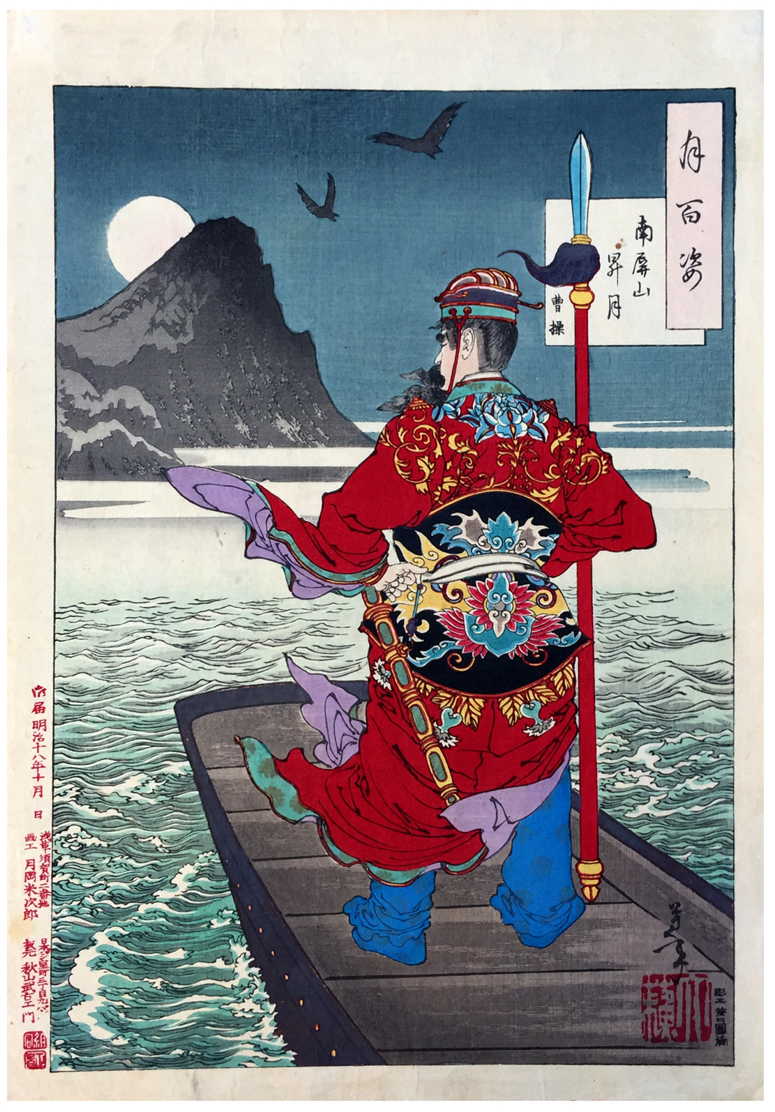 More about this print: This scene from the Chinese novel "The Romance of the Three Kingdoms" shows Cao Cao (150-220 AD), at the time the most powerful ruler in northern China, standing in a small boat, overlooking the Yangtze River.