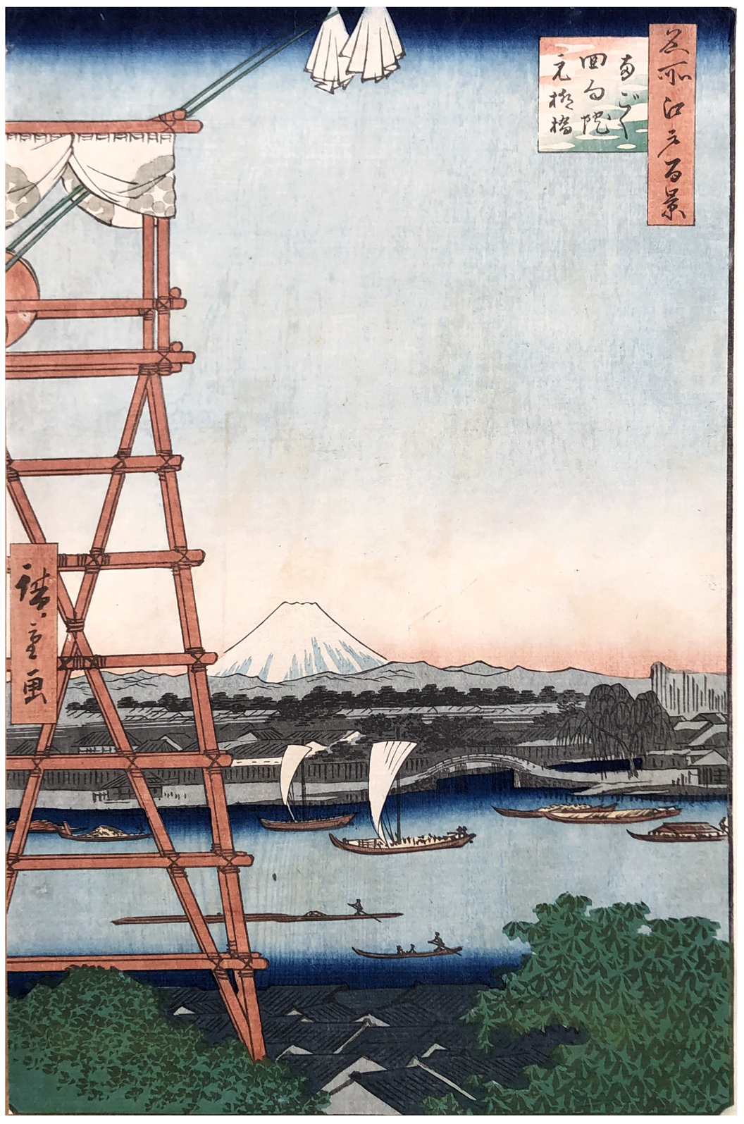 More about this print: Hiroshige has used an oblique vantage point to Mount Fuji to create a sense of excitement in an otherwise placid scene. The giant drum-tower at the left is the focus of the biannual sumo tournament on the grounds of the Buddhist temple of Ekōin. The two white cloths suspended from the tower indicate that the weather this spring day is suitable for a sumo match. Devoted fans will have already assembled in the temple precincts below. All of these fans were men; women attended only occasional practice sessions.