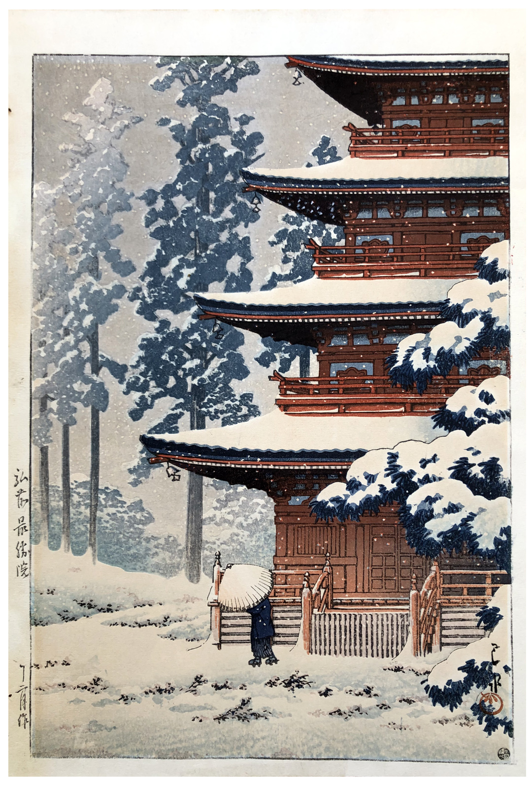 Woodblock Print Title: Saishoin Pagoda Temple in Snow