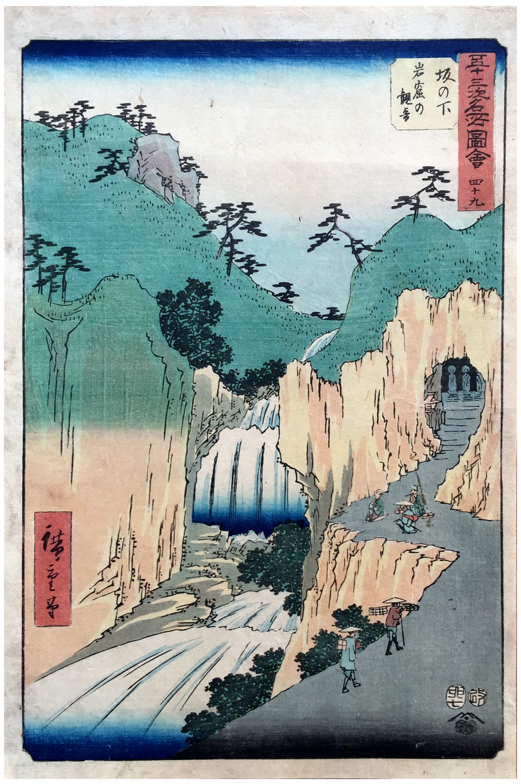 Woodblock Prints Title: No. 49, Sakanoshita: The Kannon in the Cave (Sakanoshita, Gankutsu no Kannon), from the series Famous Sights of the Fifty-three Stations (Gojûsan tsugi meisho zue), also known as the Vertical Tôkaidô