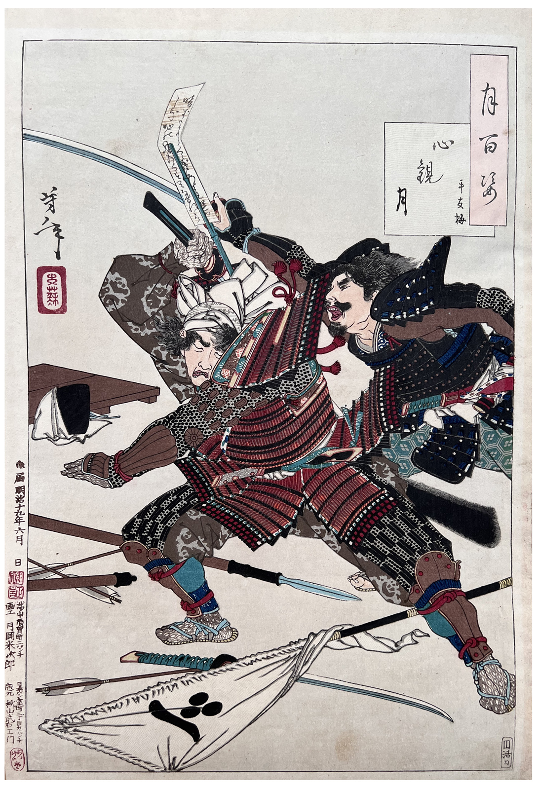 More about this print: Taira no Tomoume, a blind warrior, uses second sight to see his enemies in his clan's war against the Minamoto, and in this, supposedly his death battle. He carries a poem slip as a talisman.
