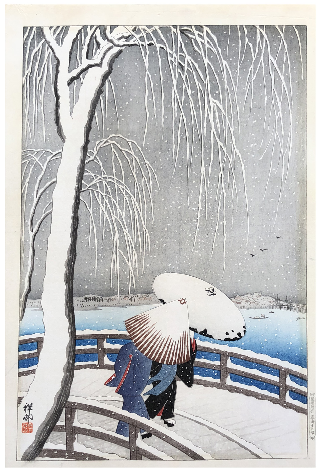 Woodblock Print Title: Snow on the Willow Bridge of Yanagibashi