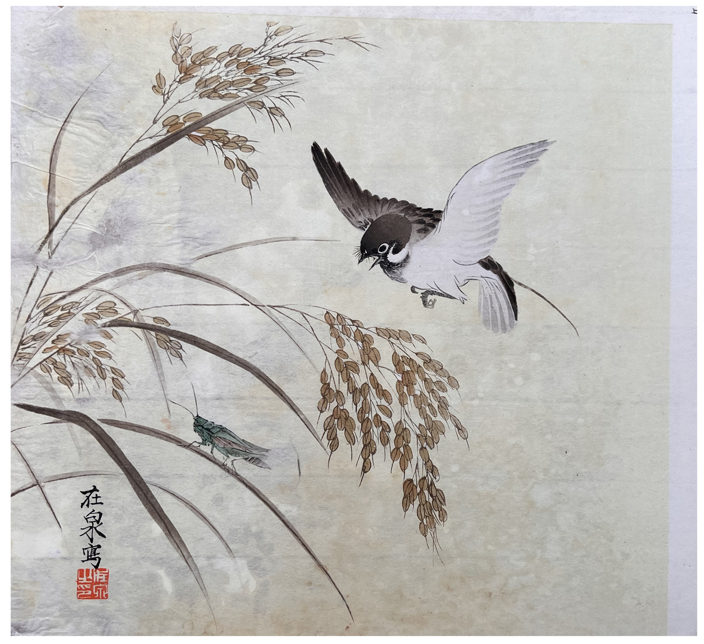 Woodblock Print Title: Sparrow, Grasshopper and Rice Ears