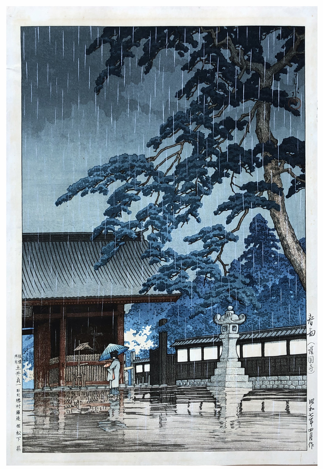 Woodblock Print Title: Spring Rain at Gokoku-ji Temple