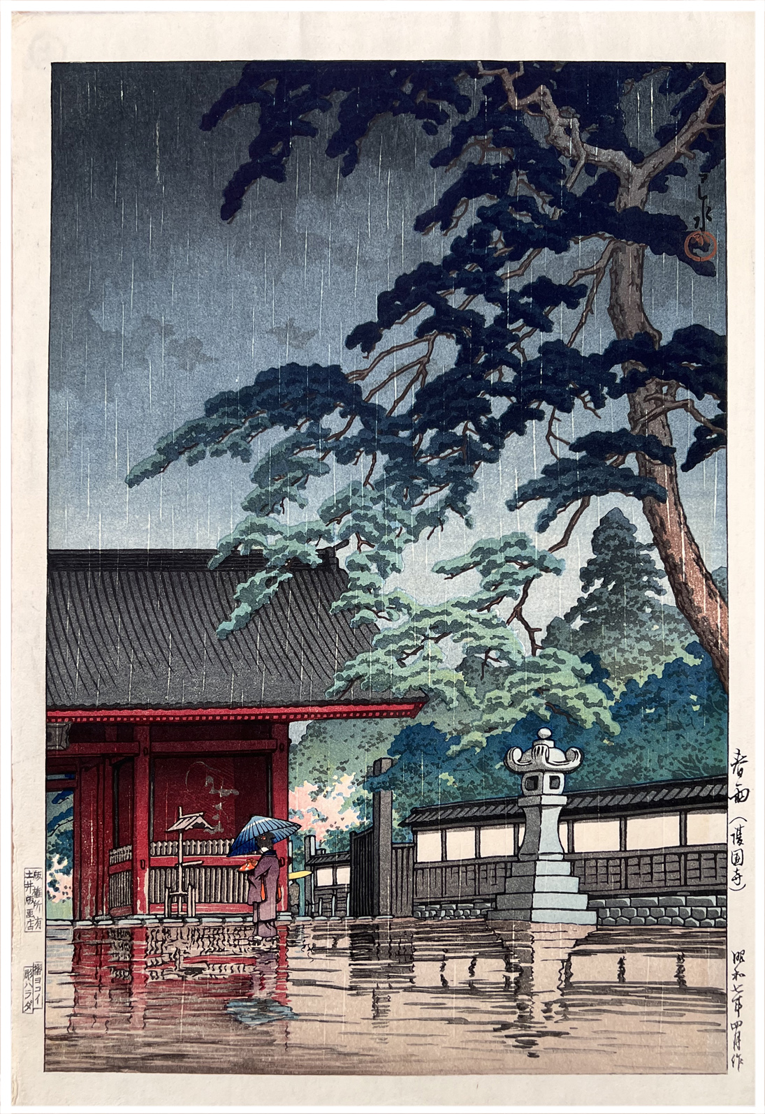 Woodblock Print Title: Spring Rain at Gokoku-ji Temple