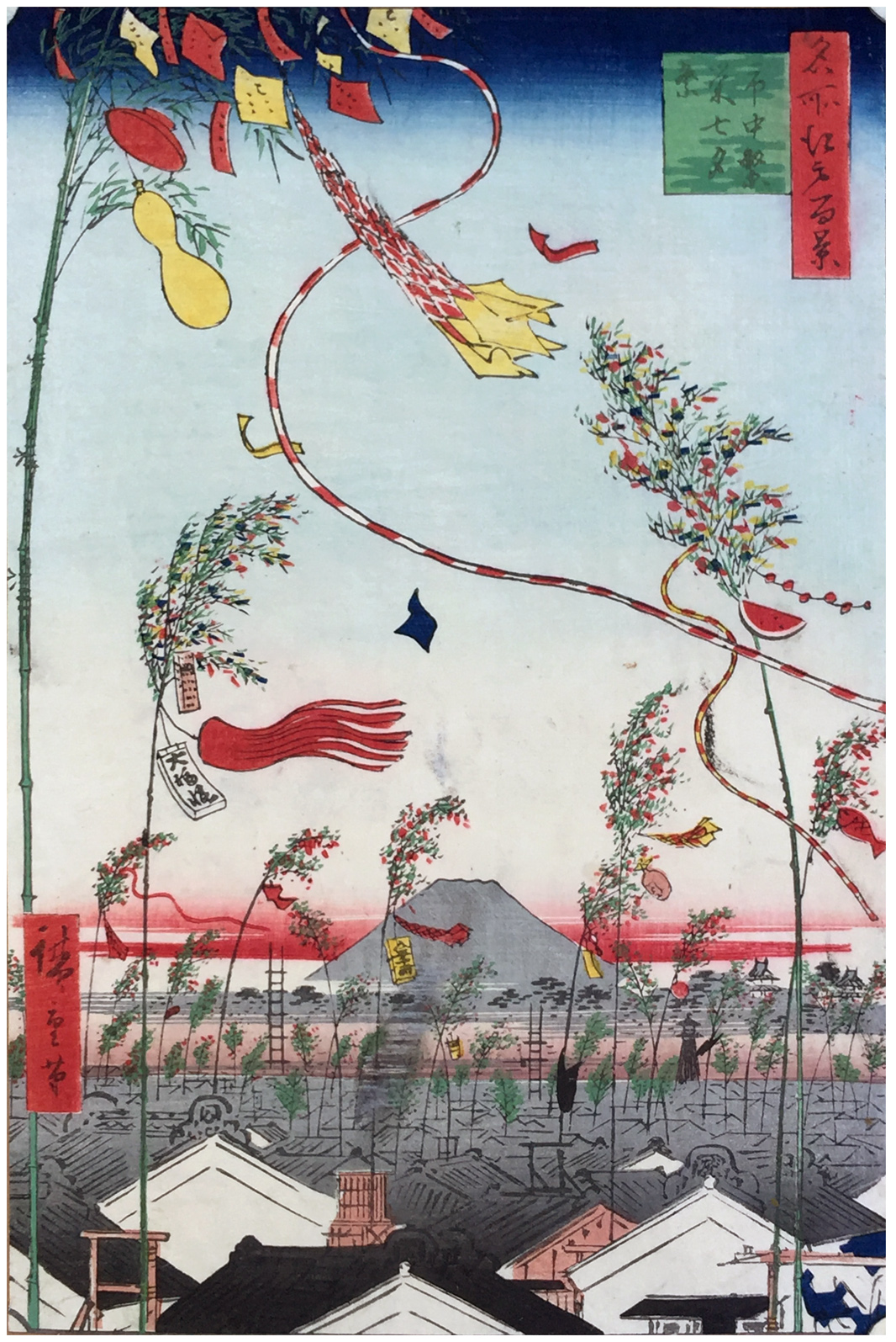More about this print: The Tanabata Festival, celebrated annually on the seventh day of the Seventh Month, derived from an ancient Chinese legend about the Celestial Weaving Girl (the star Vega) who crosses the Milky Way once a year to meet her beloved Cowherd (Altair). By the late Edo period, the Festival had developed into a huge outdoor display of inscribed, multicolored sheets of paper and auspicious paper symbols attached to long green bamboo poles. Although this is the only print in the series that does not specify a place in the title, it represents the view from a very specific, very personal place: Hiroshige's own house.