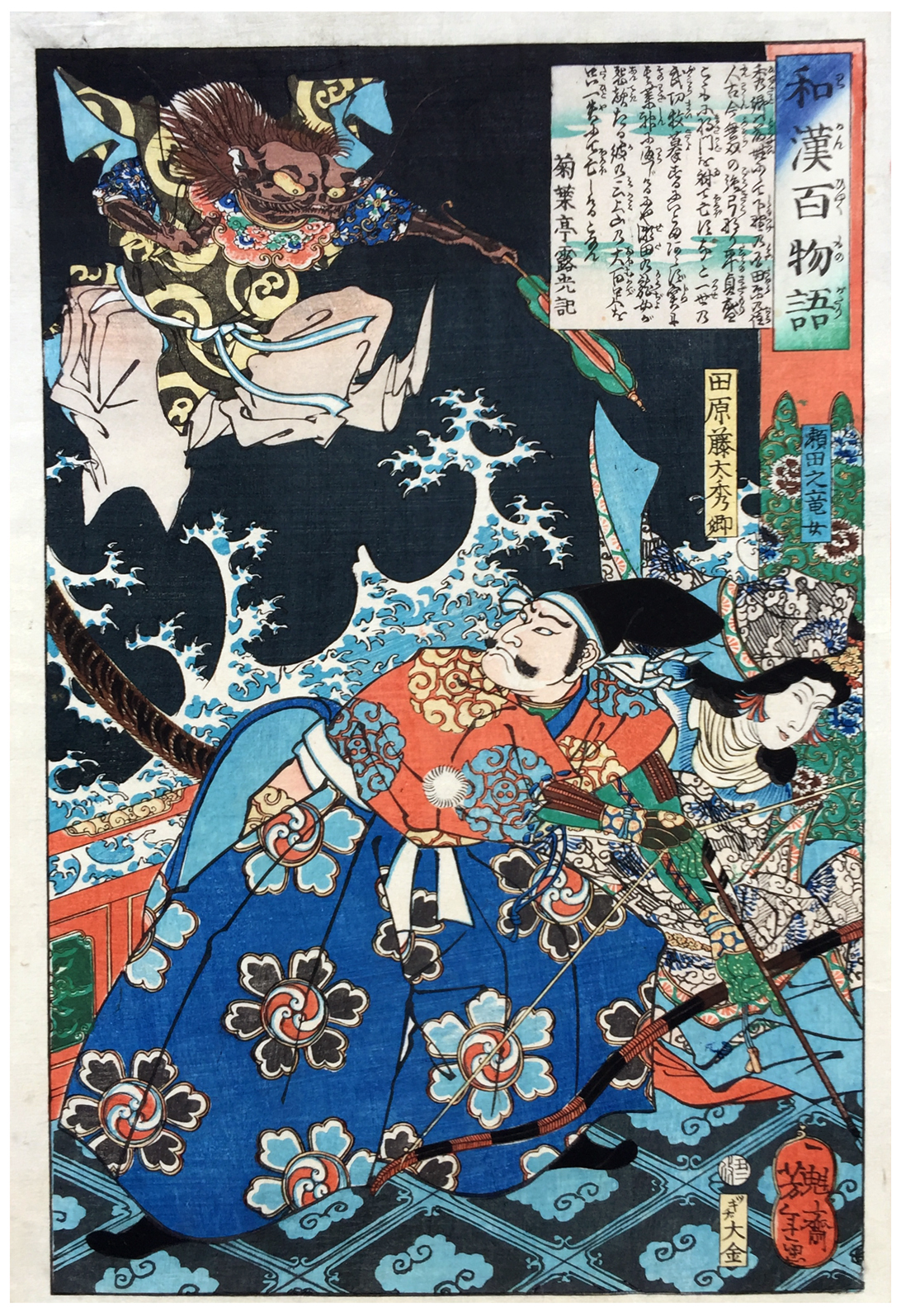 Woodblock Prints Title: Tawara Tôda Hidesato and the Dragon Woman of Seta (Seta no ryûjo), from the series One Hundred Ghost Stories from China and Japan (Wakan hyaku monogatari)