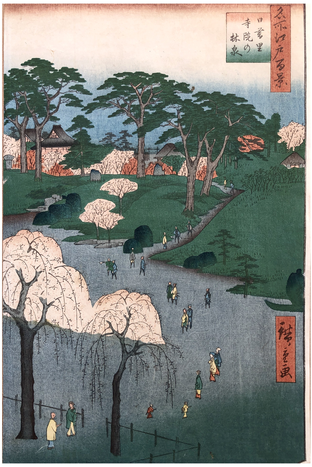 Temple Gardens, Nippori (Nippori jiin no rinsen), from the series One Hundred Famous Views of Edo (Meisho Edo hyakkei)
