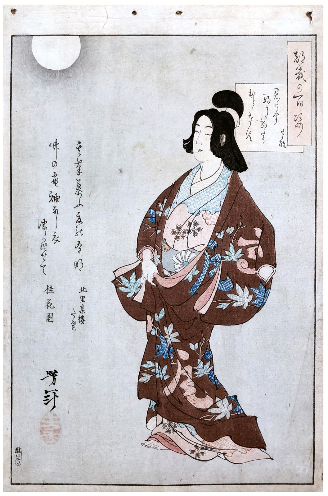 Early in the morning her lover has just left the pleasure quarters to return to the city. She hears the lonely call of the cuckoo at dawn, and composes the accompanying verse as she imagines her lover arriving at the boat landing in Komakata: "By now you must be near Komakata - a cuckoo calls."