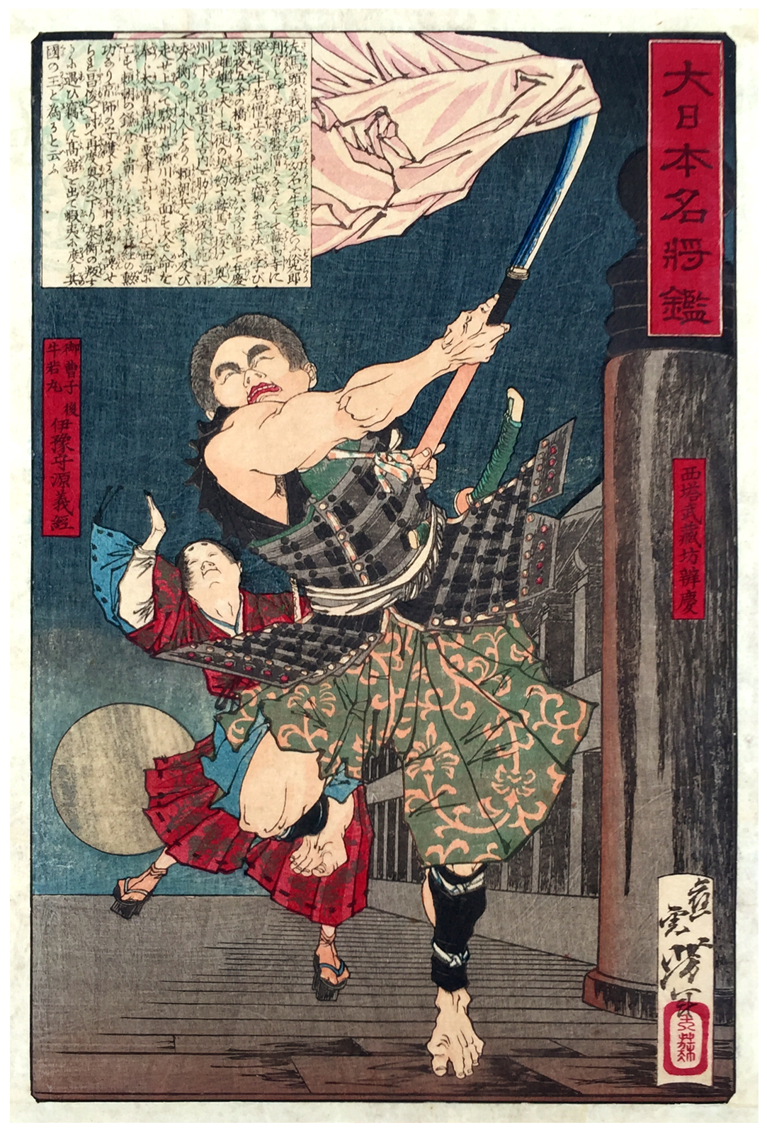 Woodblock Prints Title: The duel of Ushiwaka and Benkei (Yoshitsune) on Gojō Bridge from the series Mirror of Famous Generals of Japan.