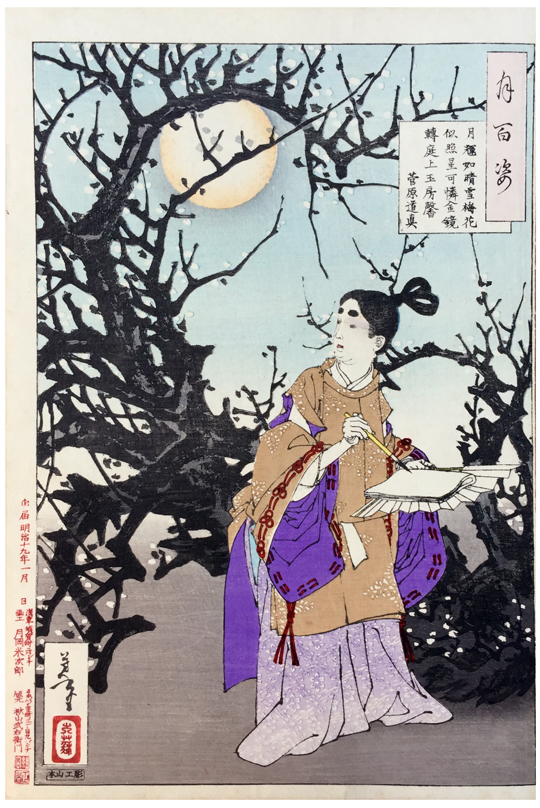 More about this print: Sugawara no Michizane (845-903 AD) was a courtier who was posthumously deified as Tenjin, the god of music, literature, and calligraphy. At age eleven, he composed the following poem in classical Chinese form: “The moon glimmers like bright snow, and plum blossoms appear like reflected stars - Ah! The golden mirror of the moon passes overhead as fragrance from the jade chamber fills the garden.”