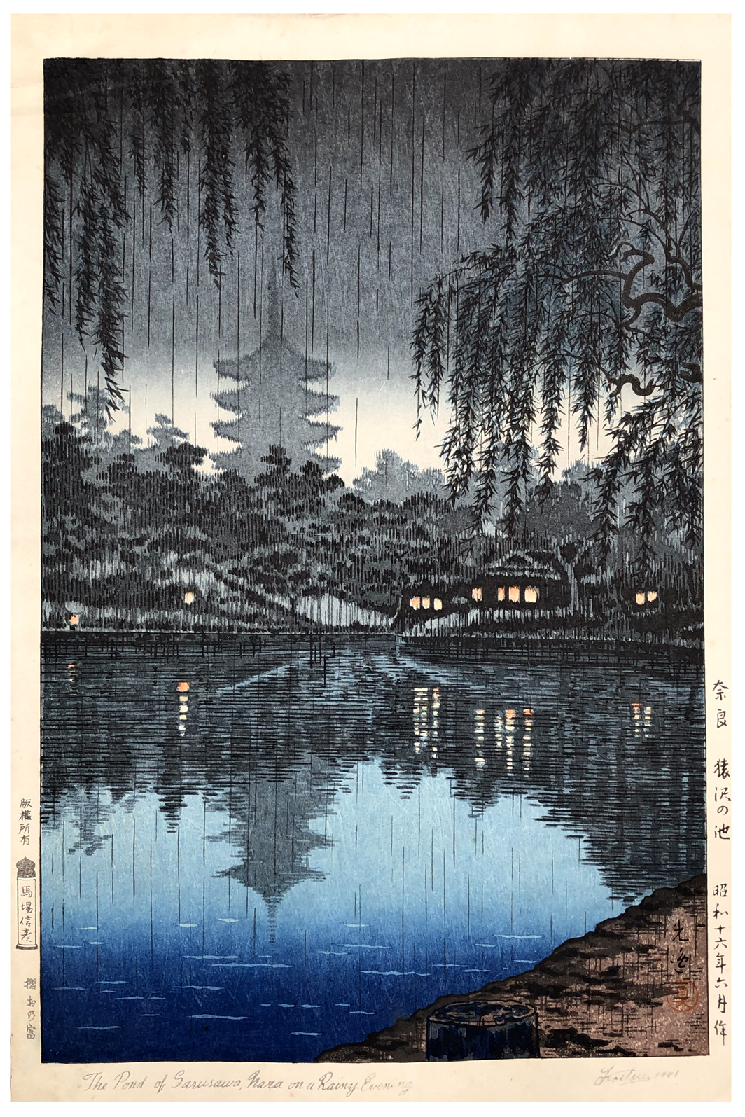 Woodblock Print Title: The Pond of Sarusawa, Nara on a rainy evening