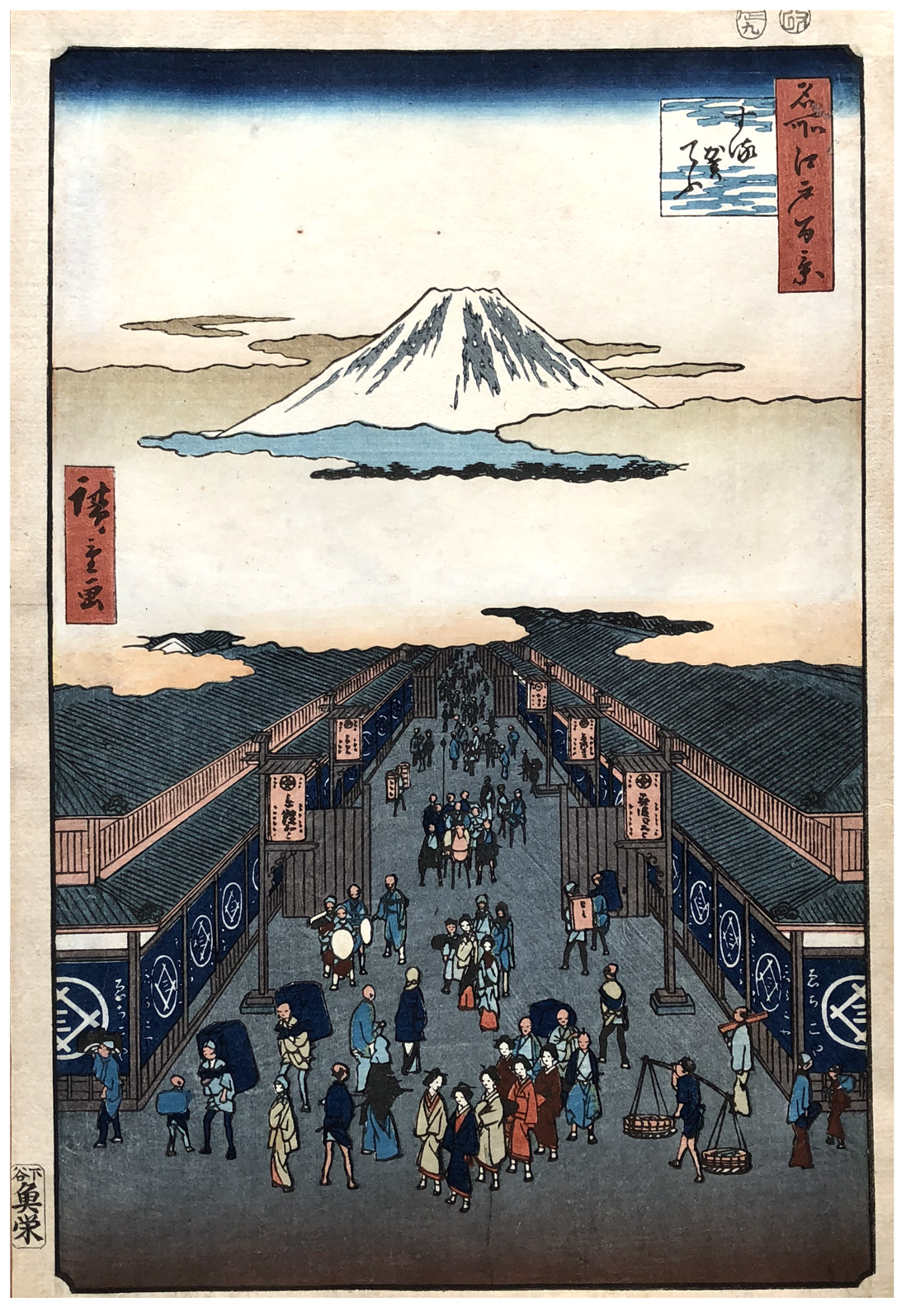 Included in this scene is Japan's premier store, Echigoya, presently Mitsukoshi Department Store, still the most venerable of all the great merchandisers of Tokyo. It is identified by its crest, a circle around the characters for "three" and "well," which together read "Mitsui."