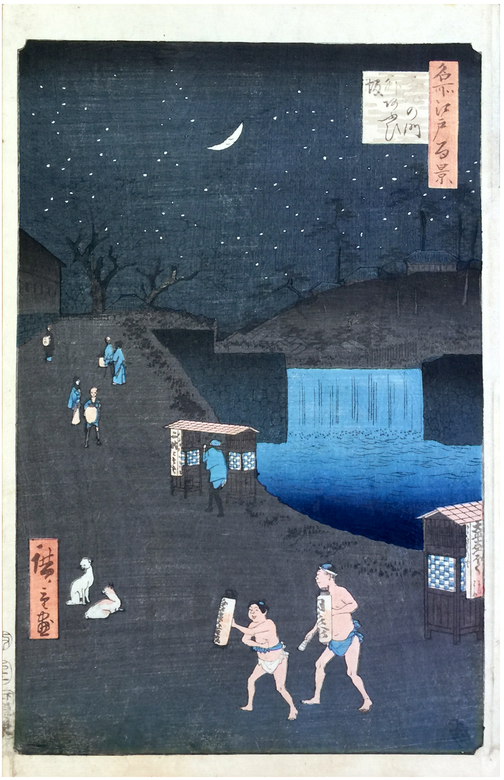 More about this print: Why are two half-naked figures out on such a chilly night? It was customary for artisan apprentices to engage in kan-mairi, wintry nighttime visits to temples and shrines where they would bathe in icy water to temper their bodies and offer prayers to the gods for the refinement of their skills.