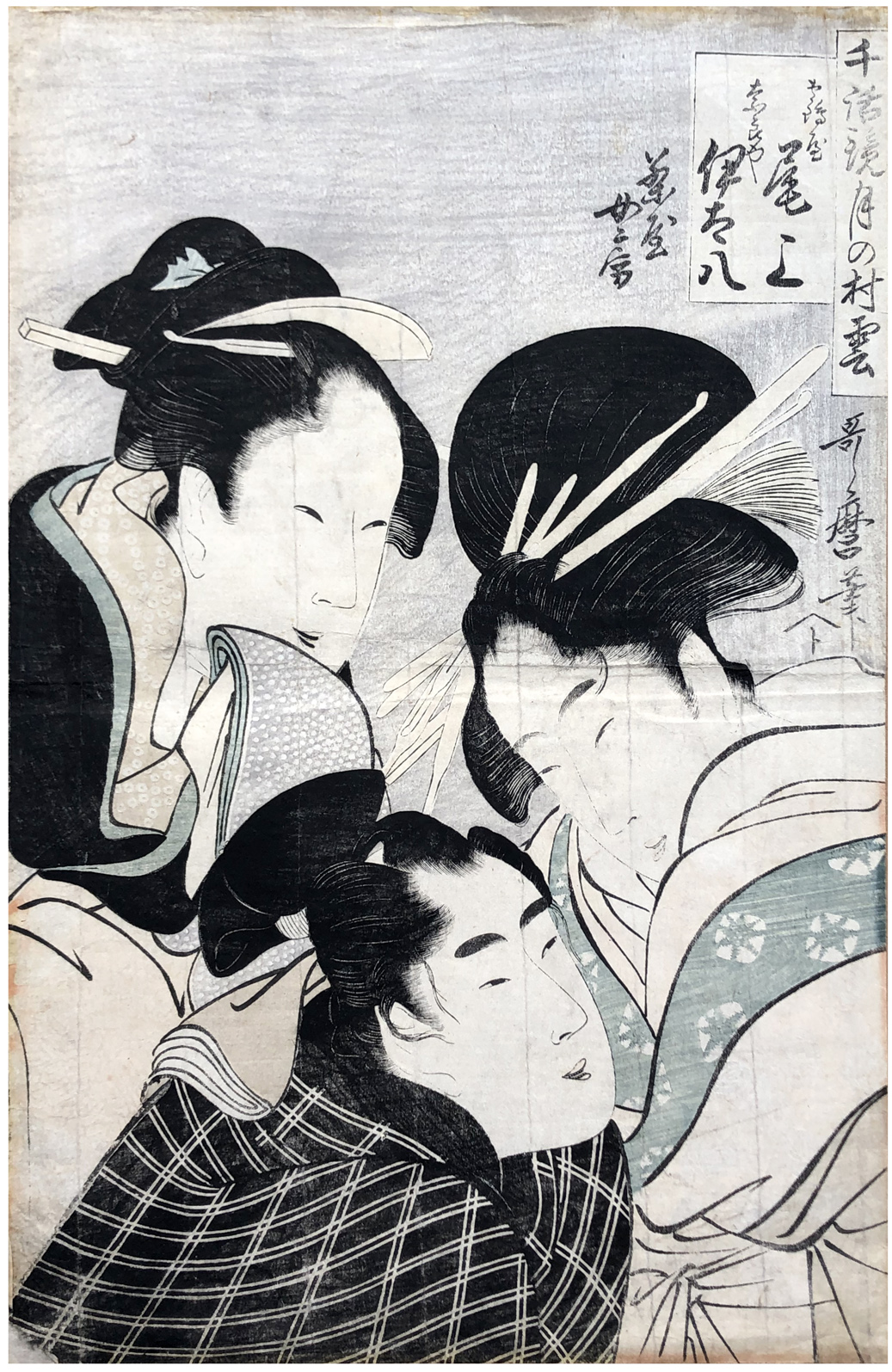 Woodblock Print Title: Tsuruya Onoe, Naraya Idahachi, and the Mistress of the Teahouse (Chaya nyobo), from the series Models of Love Talk: Clouds Form over the Moon (Chiwa kagami tsuki no murakumo)
