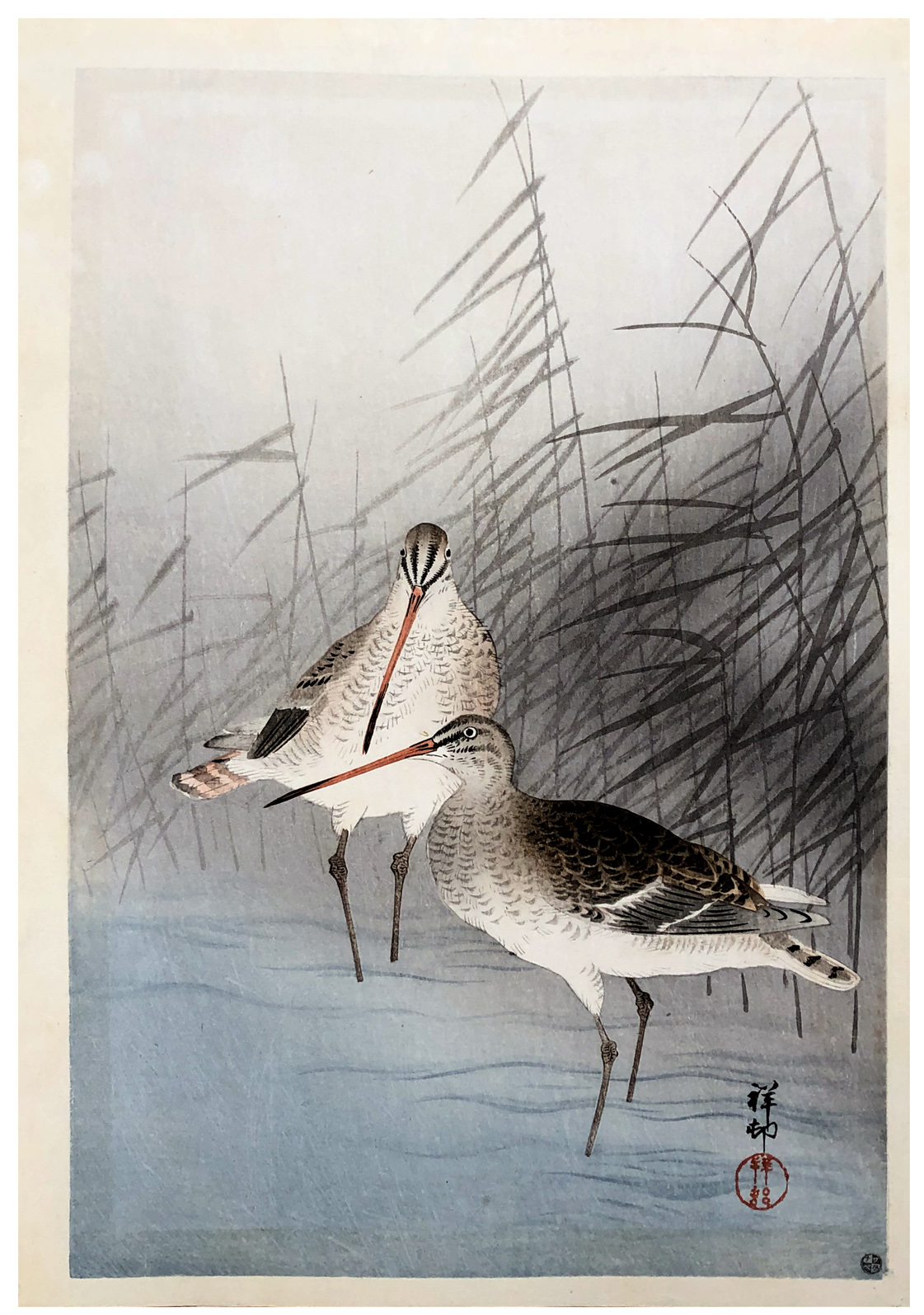Two Bar Tailed Godwits in Shallow Water and Reeds by Ohara Koson