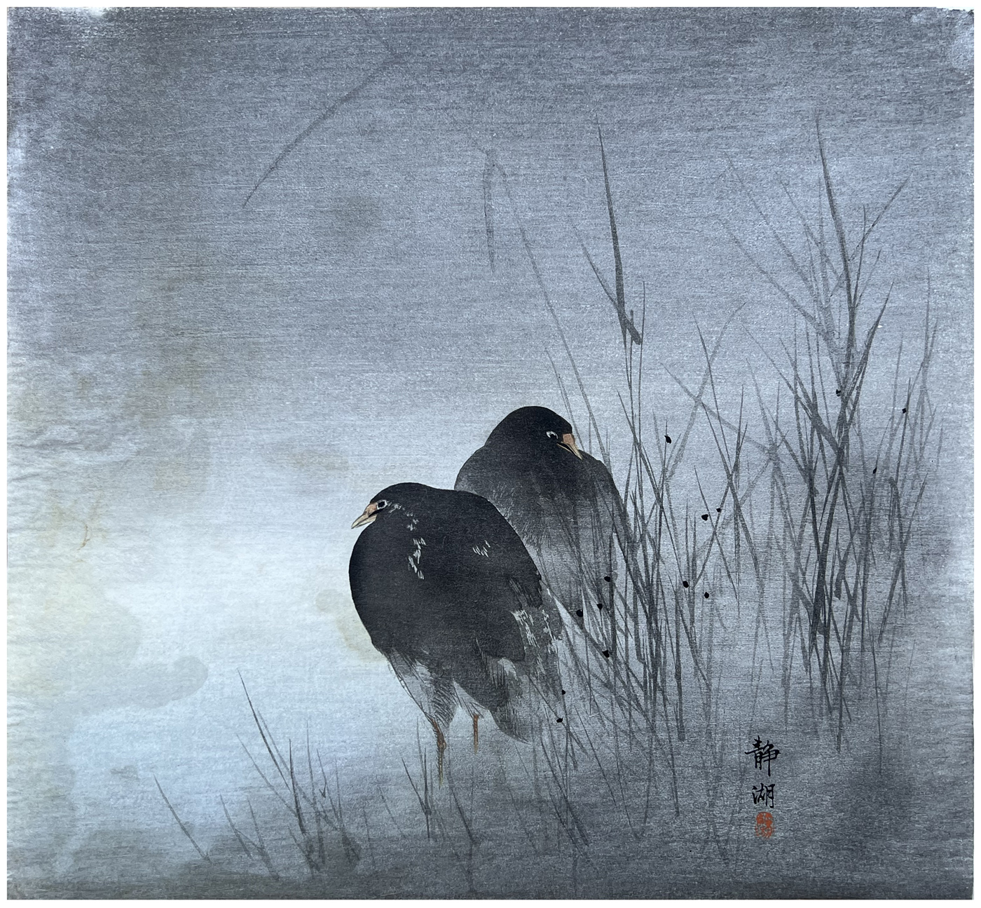 Woodblock Print Title: Two Coots Among Reeds