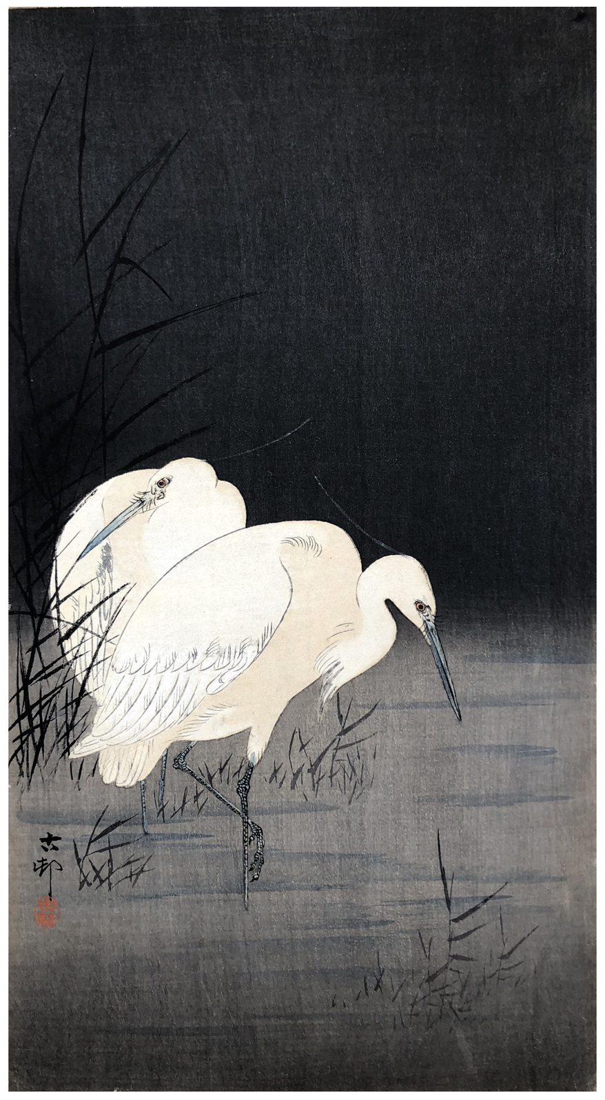 Woodblock Print Title: Two Egrets at Night