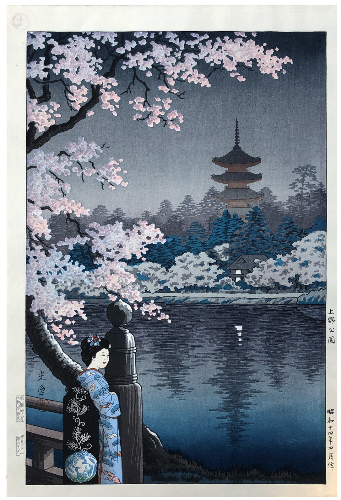 Woodblock Print Title: Geisha and Cherry Tree in Ueno Park